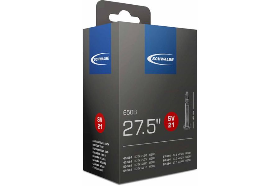 Der Schwalbe SV21 ist ein Ersatzschlauch für 27,5" Zoll (650B) Fahrradreifen mit Sclaverandventil. Der Butyl-Schlauch ist robust und wiegt rund 205g.