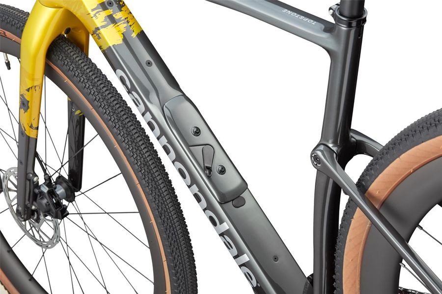 Der Hinterbau ist mit Hilfe einer Steckachse am Sitzrohr beweglich gelagert. Außerdem besitzt der Hauptrahmen flexible Zonen an Oberrohr und Sitzrohr. Dadurch kann der Hinterbau vertikal bis zu 30 Millimeter nachgeben, um Erschütterungen und Vibrationen zu absorbieren. Das bedeutet: Mehr Kontrolle, mehr Komfort, mehr Traktion. Carbon-Layup und Rohrdurchmesser werden für jede Rahmengröße angepasst, um für jeden Fahrertyp das perfekte Maß an Steifigkeit und Flex zu erzielen. Interne Zugführungen schützen vor Verschmutzung und unterstreichen das aufgeräumte Rahmendesign. Zahlreiche Montagepunkte für Zubehör machen das Topstone zu einer optimalen Basis für Bikepacking Abenteuer: Rahmen und Gabel bieten Platz für zwei Trinkflaschen und zwei Lowrider Fronttaschen. Neu dazu gekommen ist ein Staufach im Unterrohr.