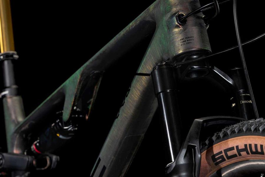 Die wichtigsten Voraussetzungen für maximalen Speed? Geringes Gewicht und höchste Effizienz! Der AMS ZERO99 C:68X 29 Rahmen erfüllt diese Anforderungen nahezu perfekt. Er besteht aus dem hochwertigsten Carbonmaterial und wiegt nur etwa 1600 g. Dazu bietet er genug Platz für 2.4 Zoll breite Reifen, die selbst unter härtesten Geländebedingungen hervorragenden Grip und Kontrolle bieten. Gemeinsam mit CUBEs Cross-Country-Team und U23-Europameistern haben sie sich außerdem für längere Kettenstreben entschieden. Dadurch können bessere Klettereigenschaften generiert und gleichzeitig ein herausragendes Handling ermöglicht werden. Schlanke Rohrsätze sorgen für ein komfortables, anstatt ruppiges Fahrverhalten und mit den integrierten Lagerschalen zur Winkelverstellung lässt sich der Steuerrohrwinkel feinjustieren. 110 mm Federweg am Vorderrad in Kombination mit einer auf Agilität und Tempo ausgelegten Geometrie erledigen den Rest. Kurz: Gegen diese Speed-Maschine hat die Konkurrenz praktisch keine Chance!