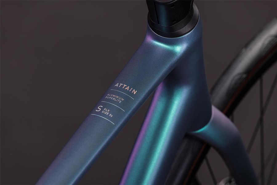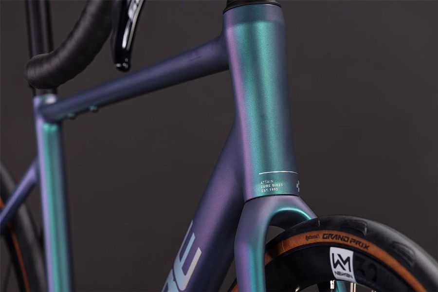 Bei der Entwicklung des semi-aerodynamischen Attain Rahmens aus 6061er-Aluminium hat CUBE viel Wert auf Performance und zugleich Komfort gelegt. Mit seinem tränenförmigen Unterrohr schneidet er zum einen pfeilschnell durch die Luft. Zum anderen sorgt die interne Zugverlegung für eine aufgeräumte Optik – und die glatten, im Smooth Welding Verfahren gestalteten Rohrverbindungen unterstreichen den hochwertigen, überaus eleganten Look. Für superpräzises Lenken und direkte Kraftübertragung sind das konische Steuerrohr und Steckachsen vorne und hinten verantwortlich. Schlanke Sitzstreben und die Vollcarbongabel absorbieren Schläge und Vibrationen von der Straße und optimieren so den Fahrkomfort. Was noch? Genügend Reifenfreiheit für die Montage von bis zu 32 mm breiten Pneus, eine sauber integrierte Sattelklemmung und Aufnahmepunkte unter dem Oberrohr. Also alles da, was es für genialen Fahrspaß braucht – aufsitzen, antreten und genießen!