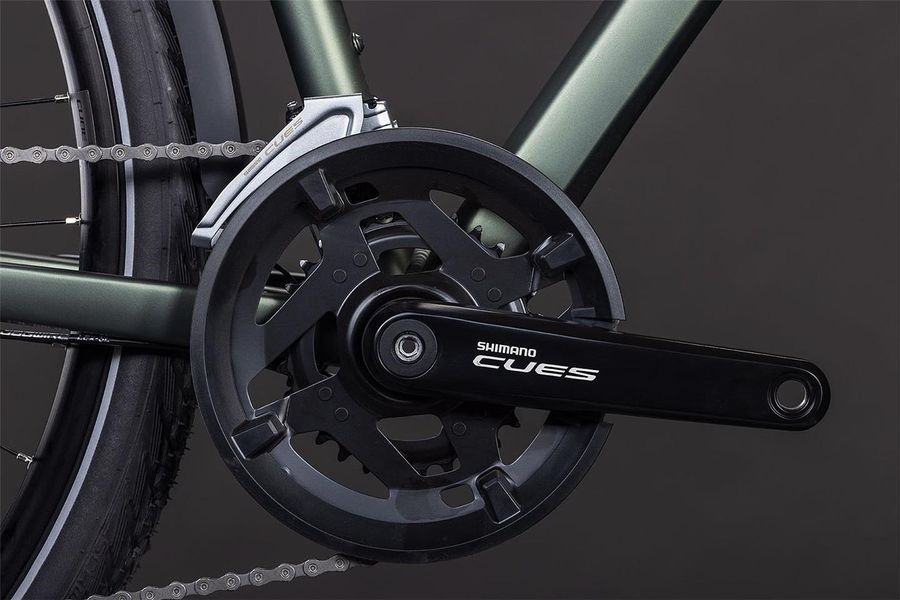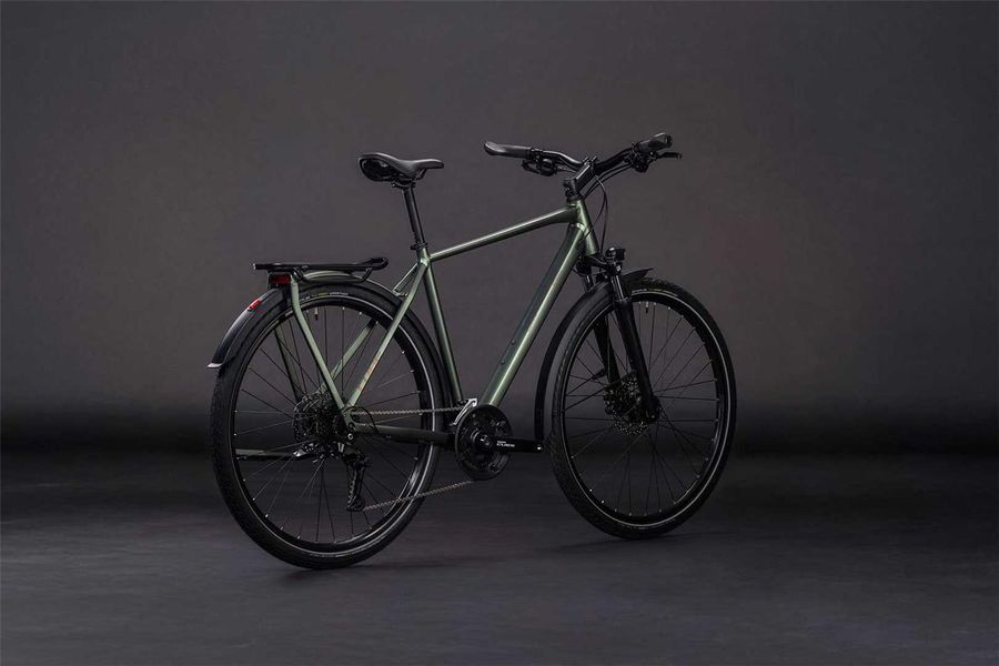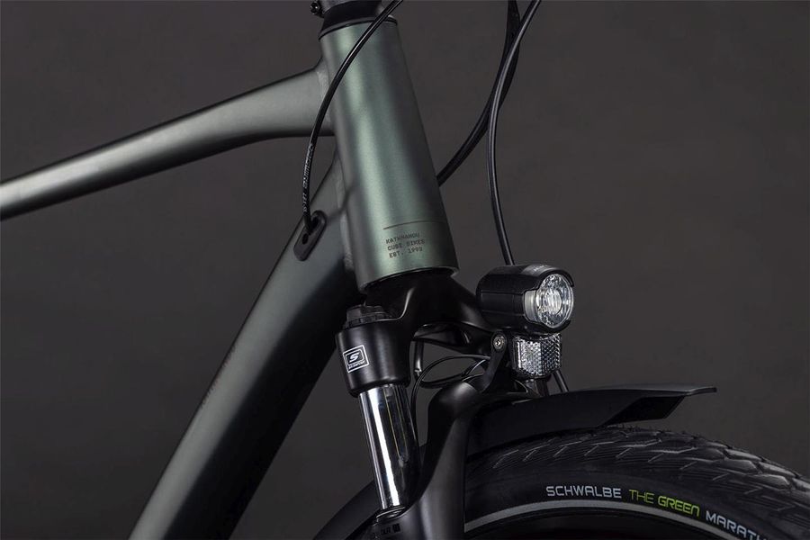 Aufsitzen, antreten und die Tour genießen: Mit dem schlichten Kathmandu ONE von CUBE bekommen Entdecker einen robusten und flexibel anpassbaren Alleskönner unter den Sattel. Auf dem stabilen, vielseitigen integrierten Gepäckträger IC 3.0 findet alles Platz, was unterwegs mit muss. ACID Schutzbleche, Vorder- und Rücklichter und ein Flat Mount Seitenständer sind auch mit dabei. Dazu hat die einfach bedienbare Cues 2x9-fach Schaltung aus dem Hause Shimano in jeder Situation den passenden Gang im Angebot. Ebenso von Shimano kommen die hydraulischen Scheibenbremsen für sicheres Verzögern und Anhalten bei jedem Wetter. Angenehmer Fahrkomfort, auch auf holprigen Wegen, ist das Spezialgebiet der Suntour Federgabel. Umweltbonus: Die spezielle Gummimischung der Green Marathon Reifen von Schwalbe besteht zum Großteil aus recycelten Altreifen – für nachhaltige Mobilität auf allen Wegen. Da kann's doch direkt losgehen, oder?