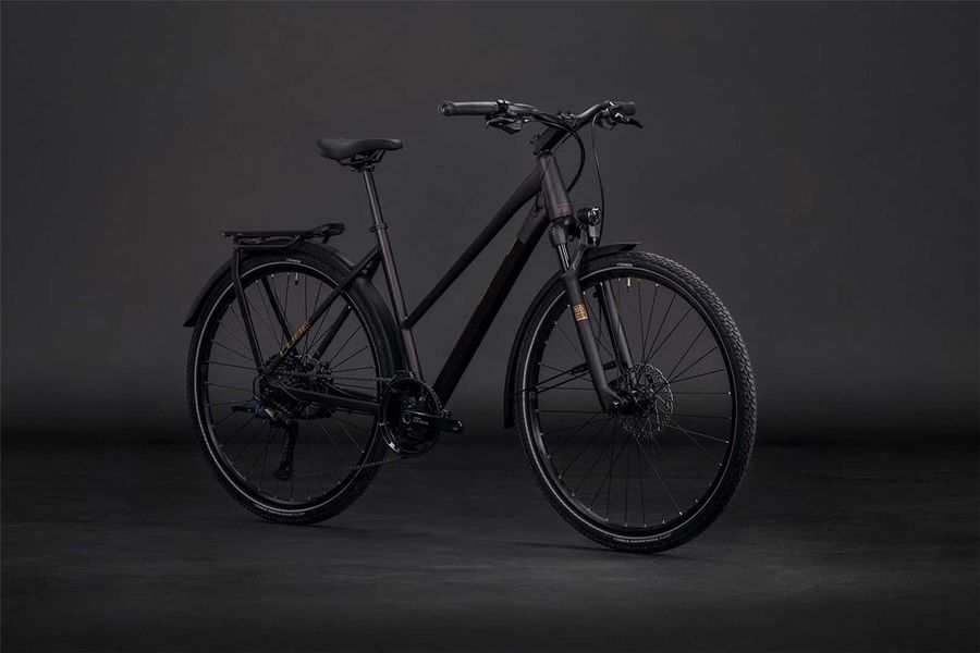 Der Trapezrahmen des Kathmandu aus dem Hause CUBE ist ein Sinnbild für klassische Eleganz! Der integrierte Gepäckträger IC 3.0 geht nahtlos und formschön in unsere ACID Schutzbleche über. Dazu gibt's am Hinterrad Aufnahmen für eine Flat Mount Scheibenbremse und einen Seitenständer. Seine cleane, aufgeräumte Optik verdankt das Chassis den im Smooth Welding Verfahren gestalteten Rohrverbindungen und im Unterrohr verlaufenden Zügen. So viel zum Aussehen. In Sachen Funktion hat CUBE den Hinterbau mit einer Steckachse versehen und ein konisches Steuerrohr für optimierte Stabilität und Lenkpräzision (selbst bei voller Beladung) verbaut. Also alles da, was es auf Tour braucht – den Rest machst du!