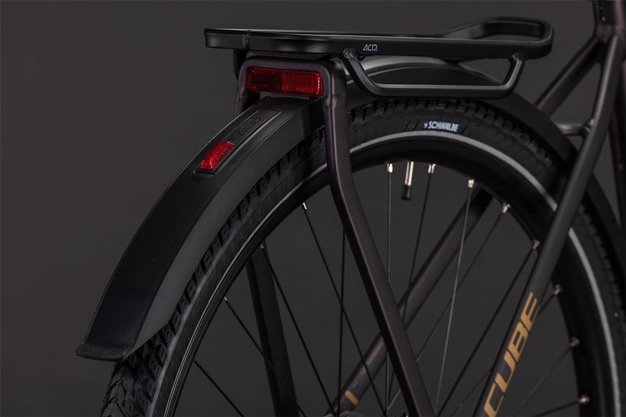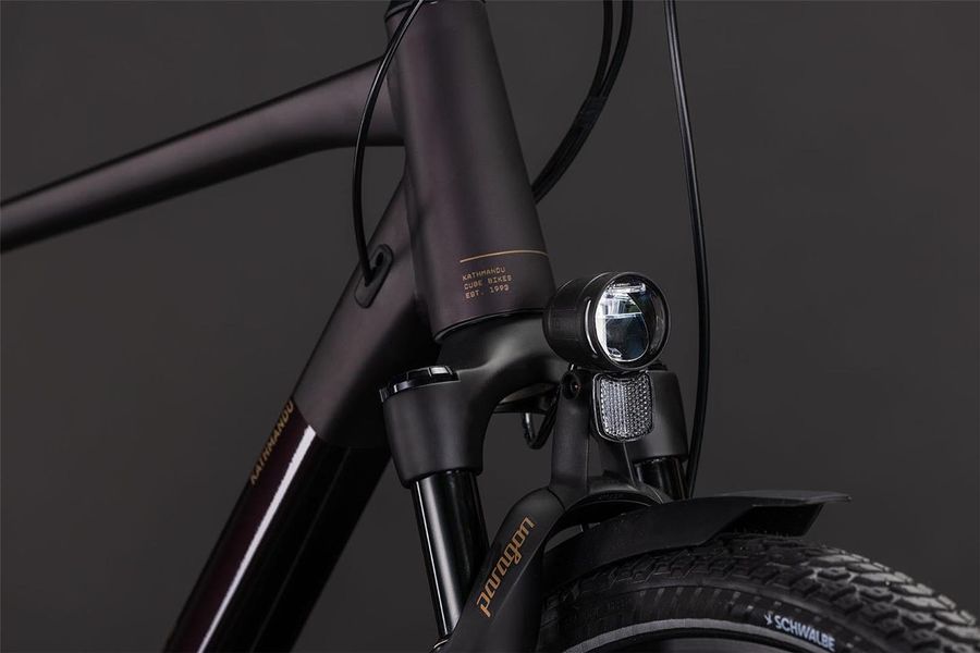 CUBE ist unter anderem für die extreme Liebe zum Detail bekannt. Deshalb hat CUBE das Kathmandu auch mit dem integrierten Gepäckträger IC 3.0 ausgestattet, der nahtlos und formschön in die ACID Schutzbleche übergeht. Dazu gibt's am Hinterrad Aufnahmen für eine Flat Mount Scheibenbremse und einen Seitenständer. Seine cleane, aufgeräumte Optik verdankt das Chassis den im Smooth Welding Verfahren gestalteten Rohrverbindungen und im Inneren verlaufenden Zügen. So viel zum Aussehen. In Sachen Funktion hat CUBE den Hinterbau mit einer Steckachse versehen und ein konisches Steuerrohr für optimierte Stabilität und Lenkpräzision (selbst bei voller Beladung) verbaut. Also alles da, was es auf Tour braucht – den Rest machst du!