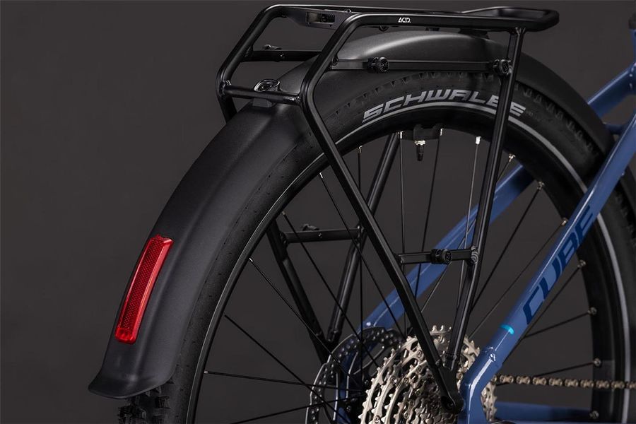 Der Nuride Hybrid Rahmen ist der Inbegriff funktioneller Ästhetik – findet CUBE zumindest und hat ihm neben der Efficient Comfort Geometry auch eine Federgabel mit 100 mm Federweg für ein Plus an Fahrkomfort und Kontrolle sowie großzügige Reifenfreiheit (sogar inklusive der mitgelieferten Schutzbleche) mitgegeben. Im Inneren verlaufende Züge und der integrierte Kettenschutz unterstreichen die cleane Optik. Ebenso harmonisch ins Rahmendesign integriert sind der Bosch CX Antrieb und der 800 Wh PowerTube Akku. On top gibt's serienmäßig verbaute Schutzbleche, Lichter, einen Seitenständer und: den formschönen, stabilen semi-integrierten Gepäckträger 2.0. Da kann das nächste Zweiradabenteuer direkt starten, oder?
