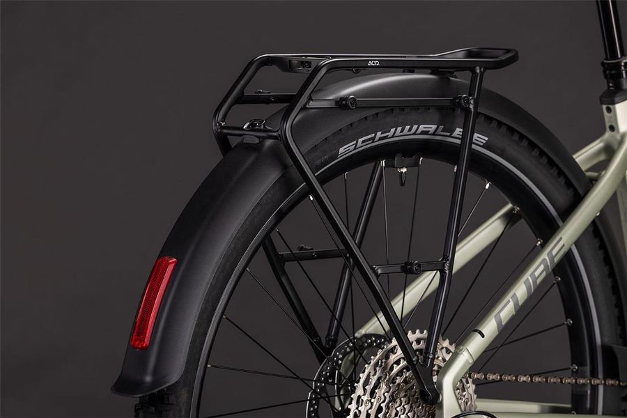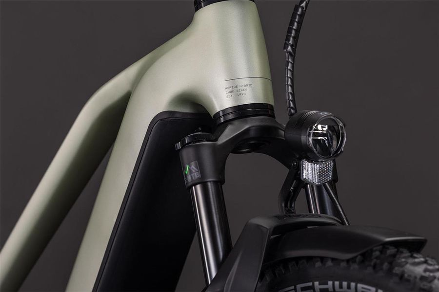 Auf den ersten Blick sieht der Nuride Hybrid Trapezrahmen vielleicht unspektakulär aus, doch wer genau schaut, wird von seiner subtilen Eleganz und den innovativen Details begeistert sein. Neben einer Federgabel mit 100 mm Federweg für ein Plus an Fahrkomfort und Kontrolle hat CUBE das Chassis mit großzügiger Reifenfreiheit (sogar inklusive der mitgelieferten Schutzbleche) ausgestattet. Im Inneren verlaufende Züge unterstreichen die cleane Optik. Ebenso harmonisch ins Rahmendesign integriert sind der Bosch CX Antrieb und der 800 Wh PowerTube Akku. On top gibt's einen integrierten Kettenschutz, serienmäßig verbaute Schutzbleche, Lichter, einen Seitenständer und den stabilen semi-integrierten Gepäckträger 2.0. Da kann das nächste Zweiradabenteuer direkt starten, oder?