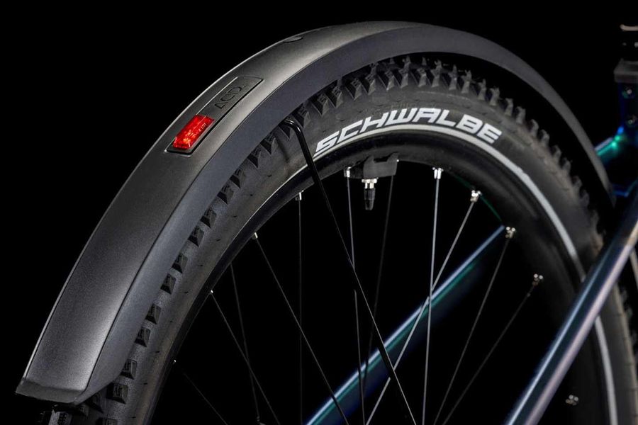 Wenn wir etwas können, dann elegante Rahmen mit 1a-Handling bauen – doch bei der Entwicklung des Nuride Hybrid haben wir uns in Sachen funktioneller Ästhetik selbst übertroffen. Neben einer Federgabel mit 100 mm Federweg für ein Plus an Fahrkomfort und Kontrolle haben wir das Chassis mit großzügiger Reifenfreiheit (sogar inklusive der mitgelieferten Schutzbleche) ausgestattet. Im Inneren verlaufende Züge unterstreichen die cleane Optik des Rahmens und verursachen kaum Wartungsaufwand. Ebenso harmonisch ins Design integriert sind der Bosch CX Antrieb und der starke PowerTube Akku. Außerdem gibt's einen Kettenschutz sowie ein UDH für einfachere Ersatzteilverfügbarkeit. Was noch? Serienmäßig verbaute Schutzbleche, Lichter und ein Seitenständer. Da kann das nächste Touren-Abenteuer kommen!