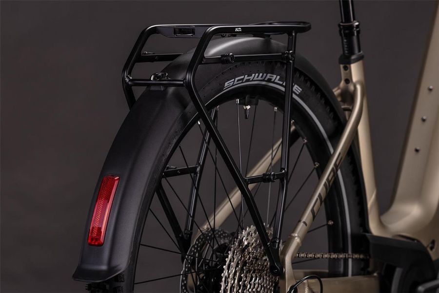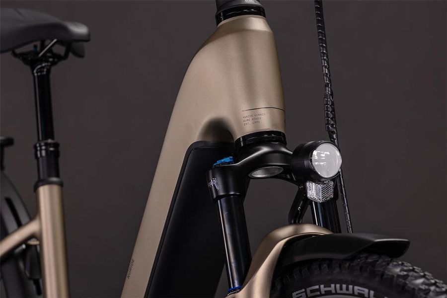 Der Tiefeinsteiger-Rahmen des Nuride Hybrid hält, was sein Name verspricht – einfaches, unkompliziertes Auf- und Absteigen sind damit fix inklusive. Doch da ist noch mehr: Neben einer Federgabel mit 100 mm Federweg für ein Plus an Fahrkomfort und Kontrolle hat CUBE das Chassis mit großzügiger Reifenfreiheit (sogar inklusive der mitgelieferten Schutzbleche) ausgestattet. Im Inneren verlaufende Züge unterstreichen die cleane Optik. Ebenso harmonisch ins Rahmendesign integriert sind der Bosch CX Antrieb und der 800 Wh PowerTube Akku. On top gibt's einen integrierten Kettenschutz, serienmäßig verbaute Schutzbleche, Lichter, einen Seitenständer und den stabilen semi-integrierten Gepäckträger 2.0. Da kann das nächste Zweiradabenteuer direkt losgehen, oder?