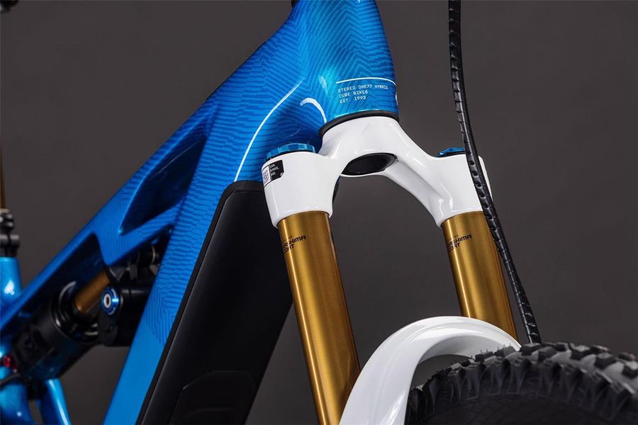 Der Rahmen des Stereo Hybrid ONE77 HPC ist wahrlich eine Klasse für sich, denn hier treffen 170 mm Federweg an der Front und am Heck auf ein Mullet-Set-up mit einem 29 Zoll Vorderrad und 27.5 Zoll Hinterrad. Damit werden Big-Mountain-Trail-Träume wahr! Wie immer bei CUBE maximal detailverliebt konstruiert auch der Rest: Integrated Cable Routing sorgt für einen supercleanen Look. Dazu kommt ein Steuersatz zur Winkelverstellung, mit dem sich das Handling an individuelle Vorlieben und Anforderungen anpassen lässt. Außerdem hat CUBE den 800 Wh starken PowerTube Akku gleich über dem Bosch CX Motor sauber und formschön ins Carbon-Unterrohr integriert. Für einfachere Ersatzteilverfügbarkeit gibt's ein UDH am Aluminium-Hinterbau – und weil CUBE auch eine Direct Mount Kettenführung verbaut hat, geht's mit diesem Fully selbst bei schwierigen Bedingungen weiter, weiter und immer weiter.