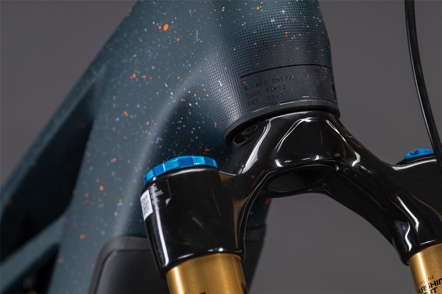 Der Rahmen des Stereo Hybrid ONE77 HPC ist wahrlich eine Klasse für sich, denn hier treffen 170 mm Federweg an der Front und am Heck auf ein Mullet-Set-up mit einem 29 Zoll Vorderrad und 27.5 Zoll Hinterrad. Damit werden Big-Mountain-Trail-Träume wahr! Wie immer bei CUBE maximal detailverliebt konstruiert auch der Rest: Integrated Cable Routing sorgt für einen supercleanen Look. Dazu kommt ein Steuersatz zur Winkelverstellung, mit dem sich das Handling an individuelle Vorlieben und Anforderungen anpassen lässt. Außerdem hat CUBE den 800 Wh starken PowerTube Akku gleich über dem Bosch CX-R Motor sauber und formschön ins Carbon-Unterrohr integriert. Für einfachere Ersatzteilverfügbarkeit gibt's ein UDH am Aluminium-Hinterbau – und weil CUBE auch eine Direct Mount Kettenführung verbaut hat, geht's mit diesem Fully selbst bei schwierigen Bedingungen weiter, weiter und immer weiter.