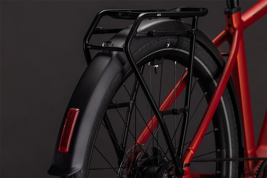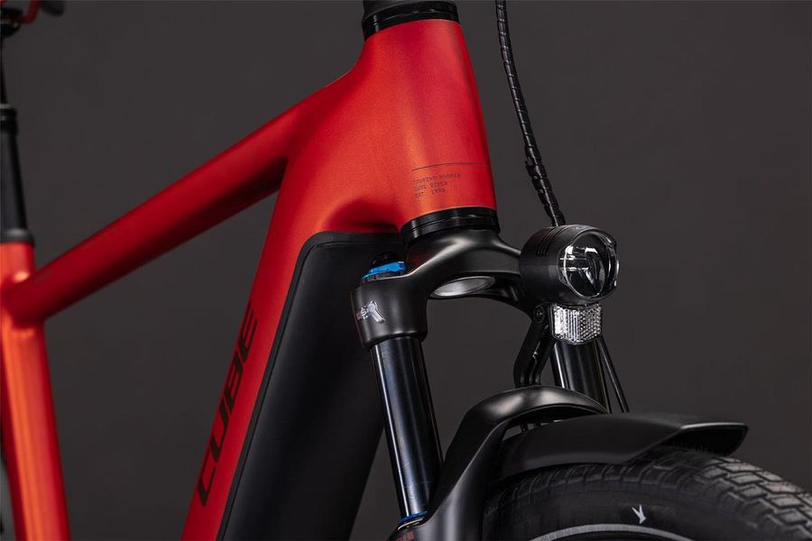 Bei der Entwicklung des Touring Hybrid Rahmens standen Vielseitigkeit, einfaches Handling und hoher Fahrkomfort ganz oben auf der Liste. Deshalb hat CUBE ihm auch direkt einen ebenso stabilen wie stylishen semi-integrierten Gepäckträger 2.0 spendiert. Darauf findet bequem alles Platz, was auf Tour mit muss. Auch der leistungsstarke Bosch Performance PX Motor fügt sich samt 800 Wh PowerTube Akku so formschön ins Design ein, dass er kaum auffällt. Was aber natürlich auffällt, ist der tolle Support im Vorwärts! Für ein komfortables und zugleich kontrolliertes Fahrgefühl, selbst auf holprigen Strecken, sind diee Efficient Comfort Geometry und die Federgabel mit ihren 100 mm Federweg zuständig. Was noch? Ein ACID Kettenschutz, ein Seitenständer, Schutzbleche und Lichter.