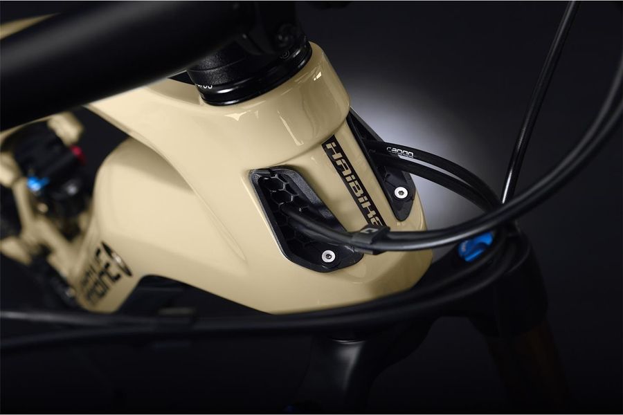 Mit dem AllMtn 7 stellt Haibike ein neues Modell in der beliebten All Mountain Klasse vor. Wenn du also auf der Suche nach einem vielseitigen und hochwertigen E-Fully bist, solltest du dir den Newcomer mal näher anschauen. Das AllMtn 7 liegt zwischen den Aluminium-Versionen (AllMtn 3, 4 und 5) und den bulligen XDURO-Modellen mit FlyOn Motor. Die Idee war es, ein Tourenbike zu entwickeln, bei dem der Fokus beim Einsatzbereich etwas mehr in Richtung Trails geht. Deshalb wurde hier auch der neue Yamaha PW-X2 Motor verbaut, der im unteren Drehzahlbereich eine sehr konstante Leistung entwickelt. In Kombination mit dem modernen Mixed-Size Laufrad-Konzept wird das AllMtn 7 zu einem wahren Kletter-Spezialisten. Denn das traktionsstarke 27,5-Zoll Hinterrad kann den Schub verlustfrei an den Untergrund weitergeben. Vorne wirkt ein leicht rollendes 29-Zoll-Laufrad wie ein zusätzlicher Dämpfer. Der neue Carbon Rahmen spricht mit seinen kantigen aber dennoch fließenden Linien eindeutig die Haibike-Designsprache. Dank der Zug-Einlassöffnung vorne am Steuerrohr wirkt die Silhouette noch aufgeräumter als bislang.
