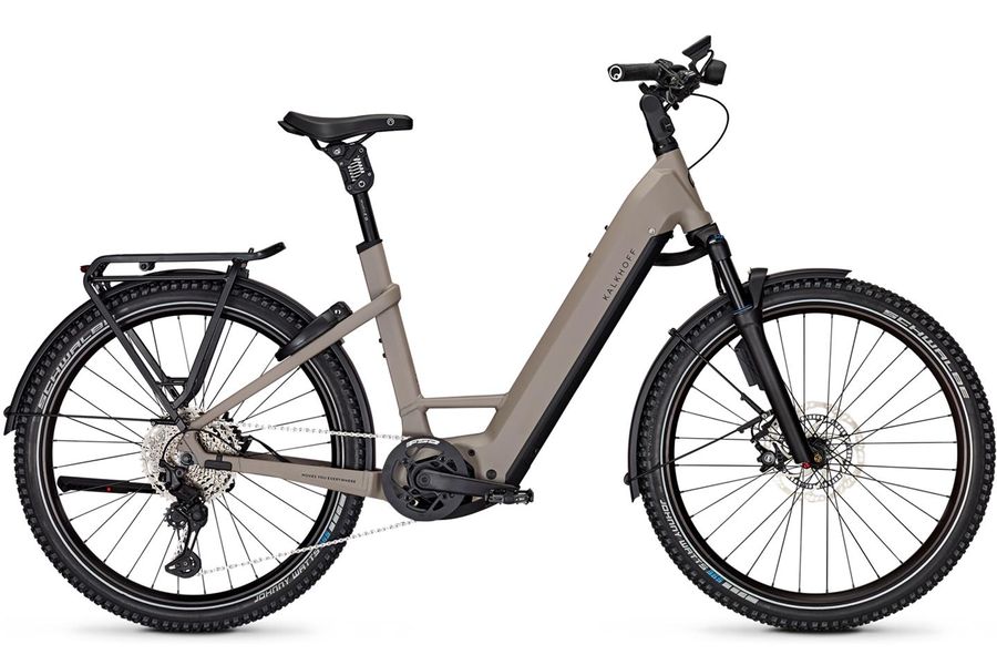 Das Topmodell der Entice Baureihe fährt technisch auf höchstem Niveau. Herzstück ist der im Durchstieg nochmals verstärkte Wave-Rahmen. Der konstruktive Kniff unterstreicht die hohe Belastbarkeit dieses E-Bikes. Denn besonders bei Tiefeinsteigern ist eine steife Konstruktion aufgrund des fehlenden Oberrohrs eine Herausforderung für die Entwickler. Das Plus(+) am Ende des Modellnamens markiert bei Kalkhoff besonders hoch belastbare Modelle, die bis zu einem Systemgewicht von 170 Kilo zugelassen sind. Zur Info: Das Systemgewicht setzt sich zusammen aus E-Bike, Fahrer und Zuladung. Der stabile Integrale 0.6 CX Aluminium Rahmen sorgt dafür, dass sich die Fahrt selbst mit Gepäckzuladung nicht schwammig anfühlt. Als weiteres Highlight ist das Entice 7.B Advance+ ABS - der Name sagt es bereits - mit Boschs einzigartigem ABS-System ausgestattet. Analog zu moderner Motorrad- oder Autotechnik sorgt eine kleine Elektronikbox dafür, dass die Bremsen stets optimal zupacken und die Räder selbst bei einer Vollbremsung auf losem Untergrund nicht blockieren. Das verringert die Sturzgefahr erheblich. Der Antrieb des Entice Topmodells ist dank des kraftvollen Bosch Performance CX Motors und eines ausdauernden 750-Wh-Akkus nie überfordert. Tagestouren bis zu 100 Kilometern Distanz sind möglich. Die weitere Ausstattung lässt keine Wünsche offen: Shimano XT 1 x 11 Schaltung, Supernova Beleuchtung und Magura Scheibenbremsen, die mit vier Kolben-Sätteln kräftig zupacken können. Die Laufräder sitzen mit Hilfe von stabilen Steckachsen in Rahmen und Gabel. Für Abstecher auf Schotter- und Waldwegen ist das Entice 7.B Advance+ mit einer Suntour Mobie34 Air Federgabel und einer gefederten Sattelstütze bestens gerüstet.