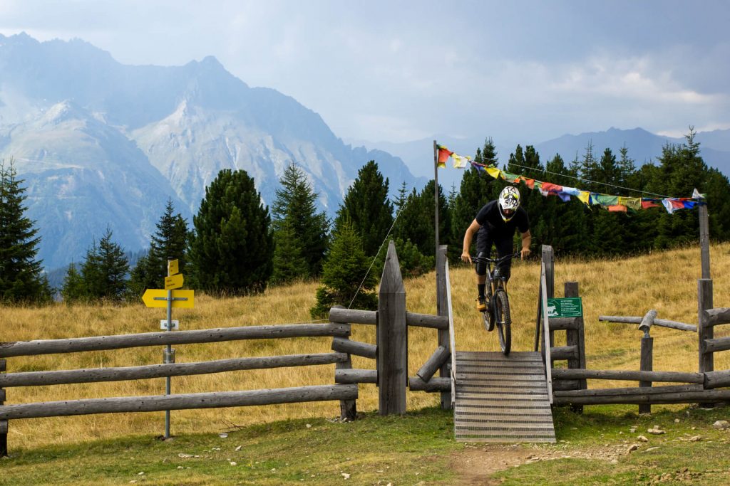 Die längste Abfahrt mit dem schönsten Panorama aber unter anderem auch den anspruchsvollsten Passagen. Los geht’s über den jump-lastigen Almtrail, für den man schon eine sehr gute Sprungtechnik braucht, um beim ersten Mal gleich alle Doubles zu schaffen. Nach einer kurzen Traverse über ein Hochplateau, vorbei an der Panzersperre und der Grenze nach Italien kann man einen kleinen Abstecher zum Aussichtspunkt über die beiden Bergseen machen, bevor sich die Trails weiter Richtung Reschensee schlängeln. Plamort-, Bunker- und Etsch-Trail hängen alle zusammen und fordern Konzentration und Fahrtechnik an steinigen, verblockten und leicht ausgesetzten Passagen. Nachdem dieser anspruchsvolle aber schöne Trail geschafft ist, fährt man einmal um den Reschensee herum und zur Schöneben-Bergbahn.