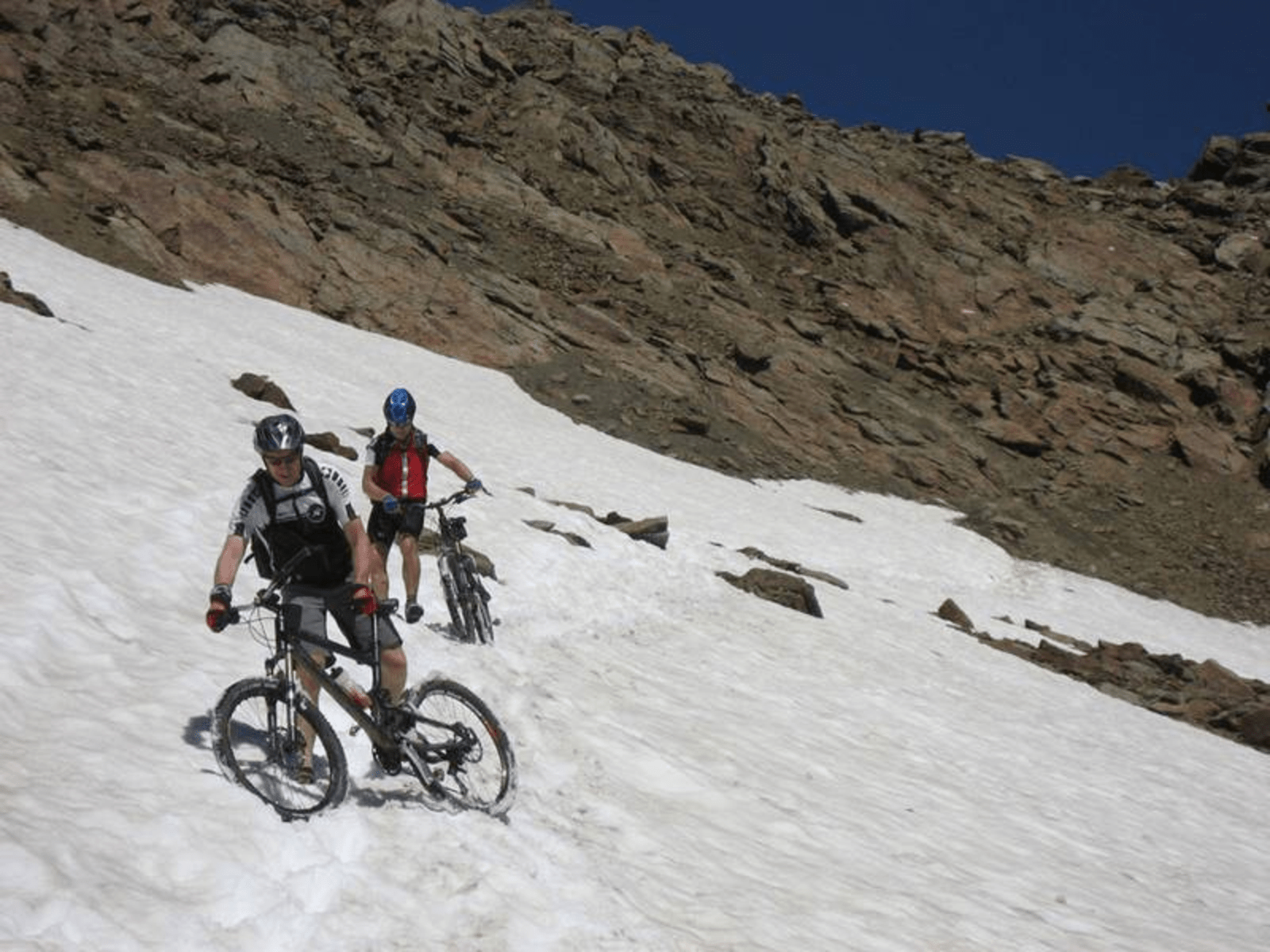 Für Biker sind Schneefelder insofern gefährlicher, da sie ja noch das Bike mit hinüber zu schleppen haben. Außerdem tragen Biker in der Regel keine griffigen Bergschuhe.