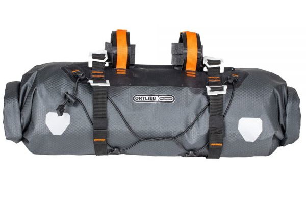 Beim Bikepacking handelt es sich eigentlich um eine Lenkerrolle. Sie sitzt vorne schräg unterhalb des Lenkers und ist in zwei Größen erhältlich. Mit Hilfe von Riemen und Distanzstücken lässt sich die Rolle an allen gängigen Lenkertypen befestigen. Ein Kunststoffeinsatz sorgt bei dem Ortlieb Handlebar-Pack für Formstabilität, Spannriemen für Kompression. Beidseitiger Zugang und die Möglichkeit, den Stauraum mit Hilfe einer optionalen Außentasche (Accessory-Pack) zu erweitern.