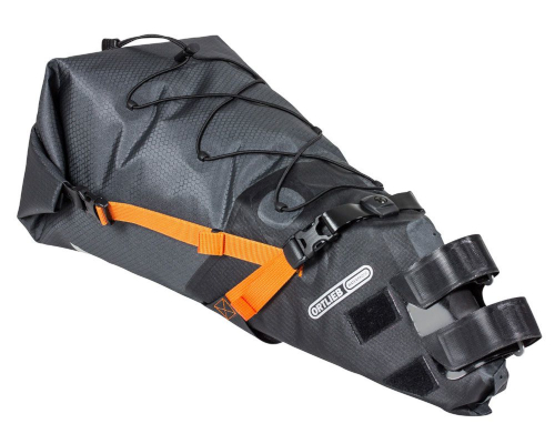 Als Haupt-Stauraum beim Bikepacking sitzt das Seat-Pack hinten unter dem Sattel. Befestigung an der Sattelstütze und am Sattelgestell. Mit Hilfe von Riemen lässt sich ihr Volumen zwischen 8 und 16,5 Litern variieren (alternativ Seat-Pack M mit 11 Litern). Hinzu kommen Kompressionsriemen und ein formstabiler Einsatz innen. Dank Gummikordel lassen sich weitere Accessoires schnell außen fixieren. Nützlich: Die Satteltasche dient gleichzeitig als Schutzblech. Einziger Nachteil: Eine versenkbare Teleskop-Sattelstütze wie sie bei einem Fully üblich ist, lässt sich damit nicht nutzen.