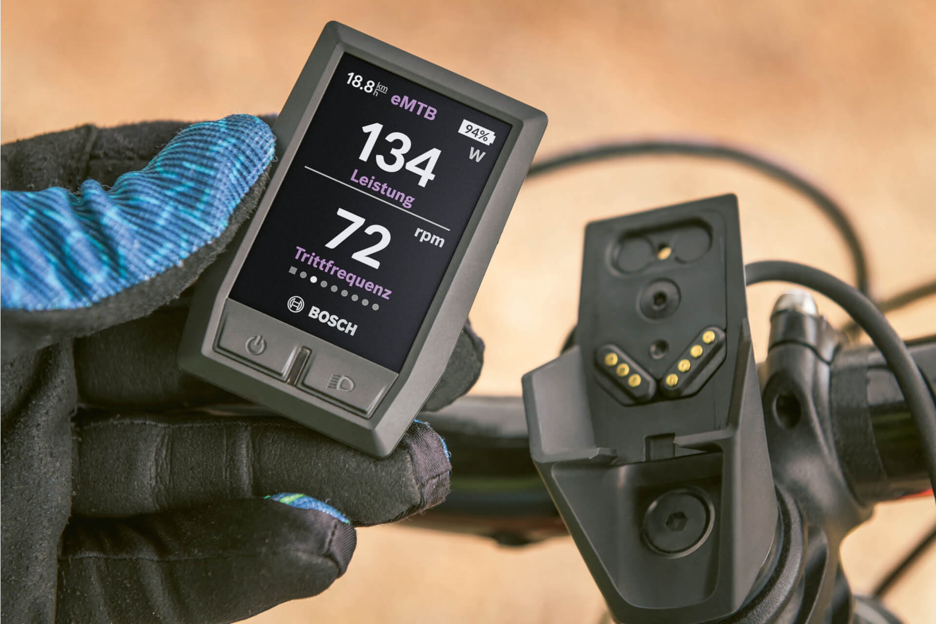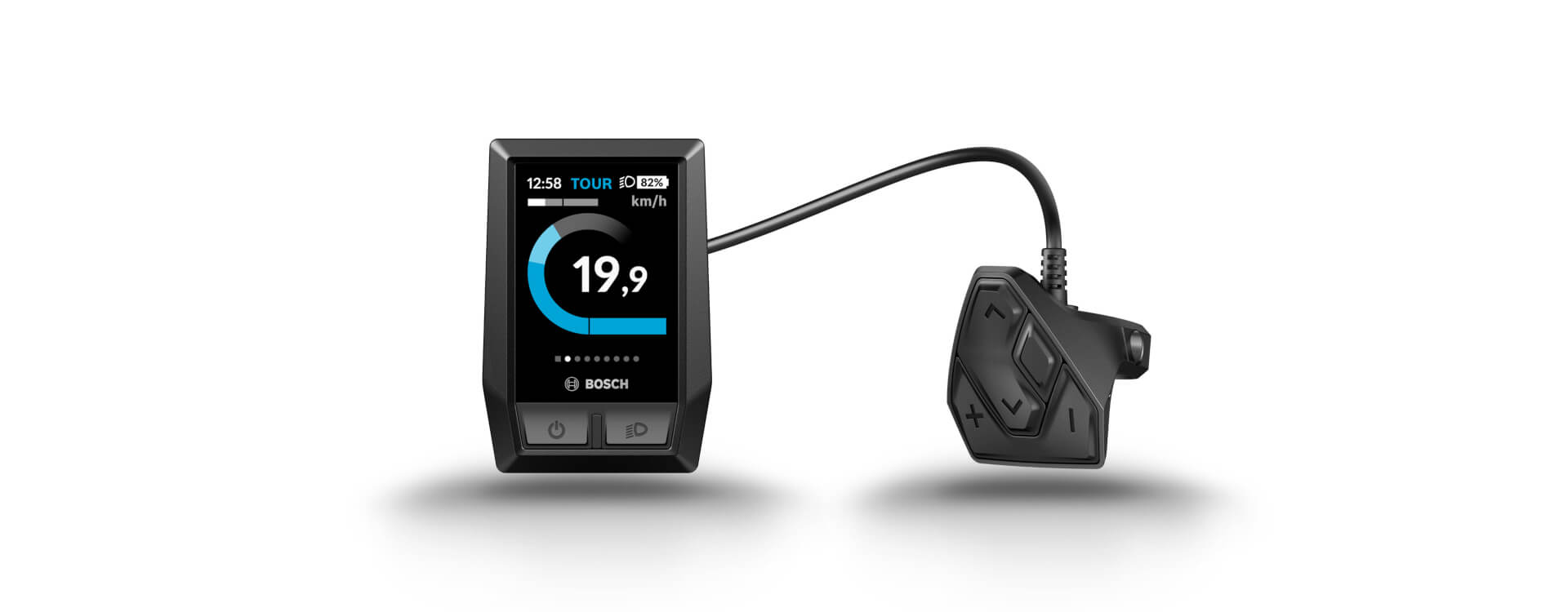 Die so genannte Remote Control Einheit (Fernbedienung) sitzt wie gewohnt neben dem linken Lenkergriff und ist über ein Kabel mit dem Bordcomputer verbunden. Auf der Remote Control befinden sich zwei Wippschalter, die mit dem Daumen bedient werden: Plus (oben) und Minus (unten) wechselt die Unterstützungsstufe von Off (Motor aus) über Eco, Tour, Sport/eMTB nach Turbo (maximale Motorpower). Die zweite Wippe rechts davon ist horizontal angeordnet und scrollt nach links oder rechts durch die Menüseiten. Auch die 2-stufige Schiebehilfe wird über die Fernbedienung aktiviert und deaktiviert.