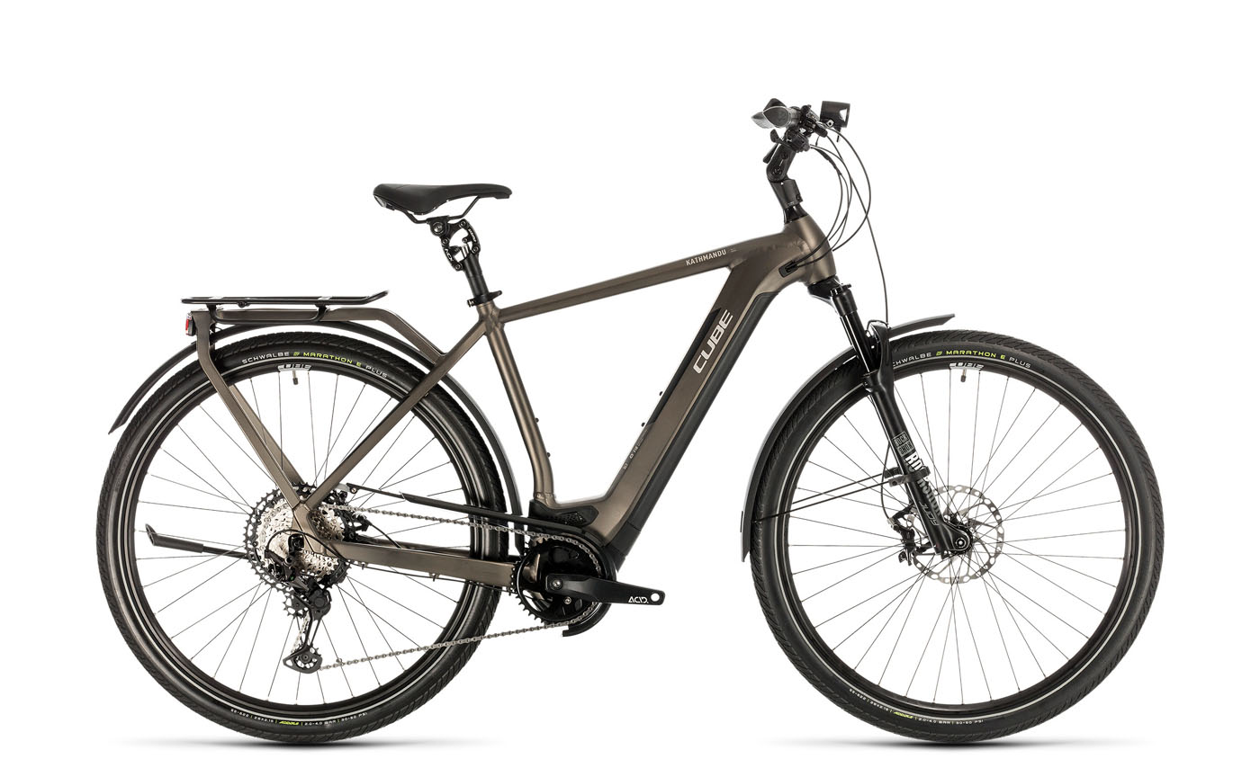 Bei den Touren- und Reiserädern setzt das Kathmandu Hybrid seit Jahren den Maßstab. Es kommt stets mit kompletter Straßenausstattung. Highlight ist der fest mit dem Hauptrahmen verschweißte Gepäckträger, der am neuen Modell eine um 20 Prozent höhere Steifigkeit aufweist. Bis zu 25 Kilo kann man hinten zuladen, ohne dass das Kathmandu ins Schlingern gerät. Das perfekte Reiserad, zumal der neue 625-Wh-Akku große Ausdauer hat! Das Kathmandu Hybrid gibt es in sechs Preisklassen, angefangen beim Hybrid One 625 für 2688 Euro. Die Topmodelle Kathmandu Hybrid SL (3499 Euro) und Kathmandu Hybrid SLT (Abbildung, 3999 Euro) sind sogar mit hochwertigen E-MTB-Federgabeln ausgestattet (RockShox Judy Silver TK Air und Judy Gold RL Air). Speziell für Langstrecken-Pendler ist das Kathmandu Hybrid 45 interessant, ein bis 45 km/h schnelles Speed Pedelec (3999 Euro).