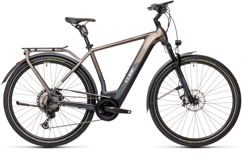 Mit Bosch Performance CX Motor ist und bleibt das Kathmandu Hybrid das stärkste CUBE E-Bike für Touren und Reise. Für Langstrecken-Komfort sorgen neben der Efficient Comfort Geometrie eine gefederte Sattelstütze, eine 100-Millimeter-Federgabel sowie ein schnell verstellbarer Vorbau. Der fest verschweißte Gepäckträger garantiert selbst bei hoher Zuladung eine stabile und sichere Fahrt. Neu: Für die Modelle EXC, SL und SLT hat CUBE jetzt einen noch komfortableren Tiefeinsteiger Rahmen entwickelt (Easy Entry). Hier bietet der Durchstieg noch mehr Beinfreiheit beim Auf- und Absteigen (lieferbar ab Frühjahr 2021). Außerdem kommen die Modelle SL und SLT jetzt serienmäßig mit dem neuen GPS-fähigen Bosch Nyon Display (siehe Cross Hybrid). Wer auch bergab 100 Prozent sicher gehen will findet beim Kathmandu Hybrid SLT eine komplette Shimano XT 1×12 Ausstattung mit starken Vier-Kolben-Scheibenbremsen vorne und hinten.
