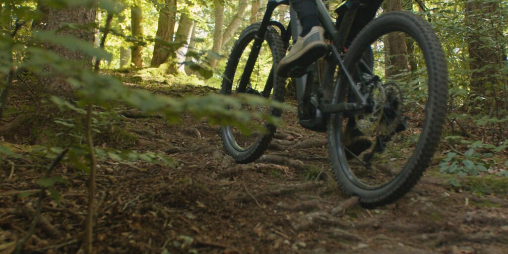 Bei Kurvenfahrten vermittelt das Bike, bedingt durch das zentral gelagerte Gewicht des Motors und Akkus, viel Stabilität und Sicherheit. Das Rad liegt ruhig, auch wenn die Kurve etwas ruppiger wird. Etwas gewöhnungsbedürftig fühlt sich die Lenkung des Stereo Hybrid an. Besonders in der steilen Einstellung von 65,4 Grad Lenkwinkel reagiert das Stereo super schnell auf Lenkinput. Das verleiht dem Bike zwar einen lebhaften Charakter, erfordert aber eben etwas Umgewöhnung, um übermäßige Lenkmanöver zu verhindern.