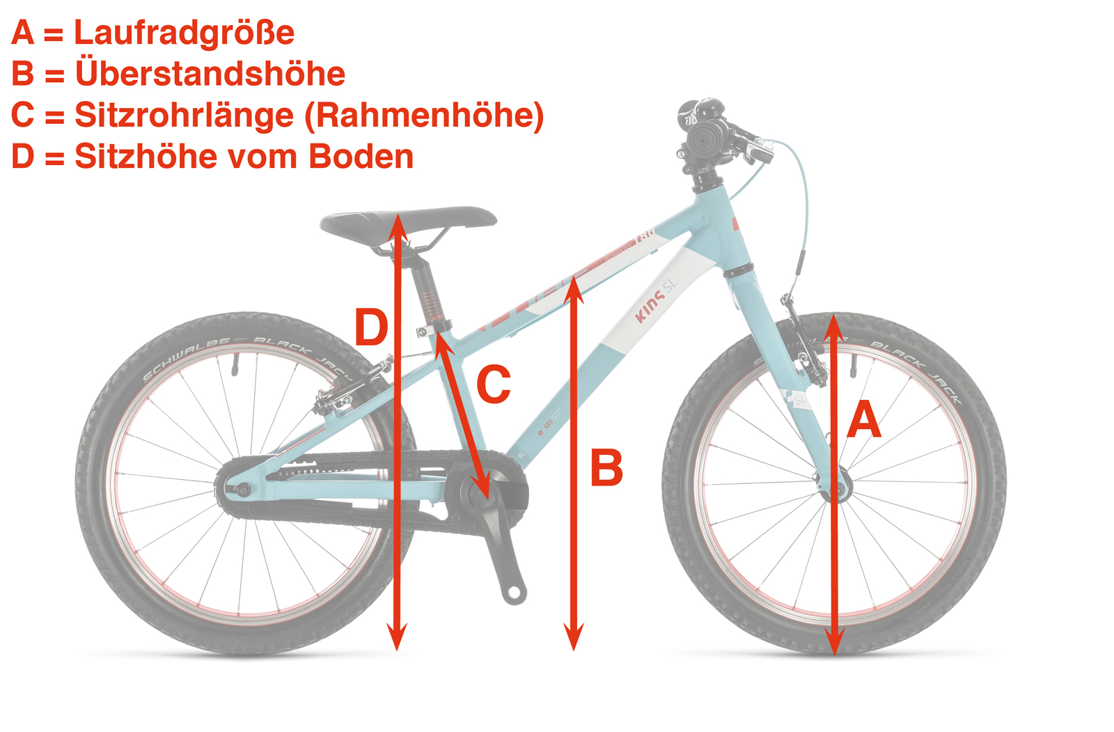 Die Grafik verdeutlicht, wie wichtig die Innenbeinlänge des Kindes ist, um ein passenden Bike zu finden. Im Gegensatz zum Erwachsenenbike, wo die Sitzrohrlänge C (Rahmenhöhe) das entscheidende Maß ist, muss man beim Kinderbike vom Boden aus messen.