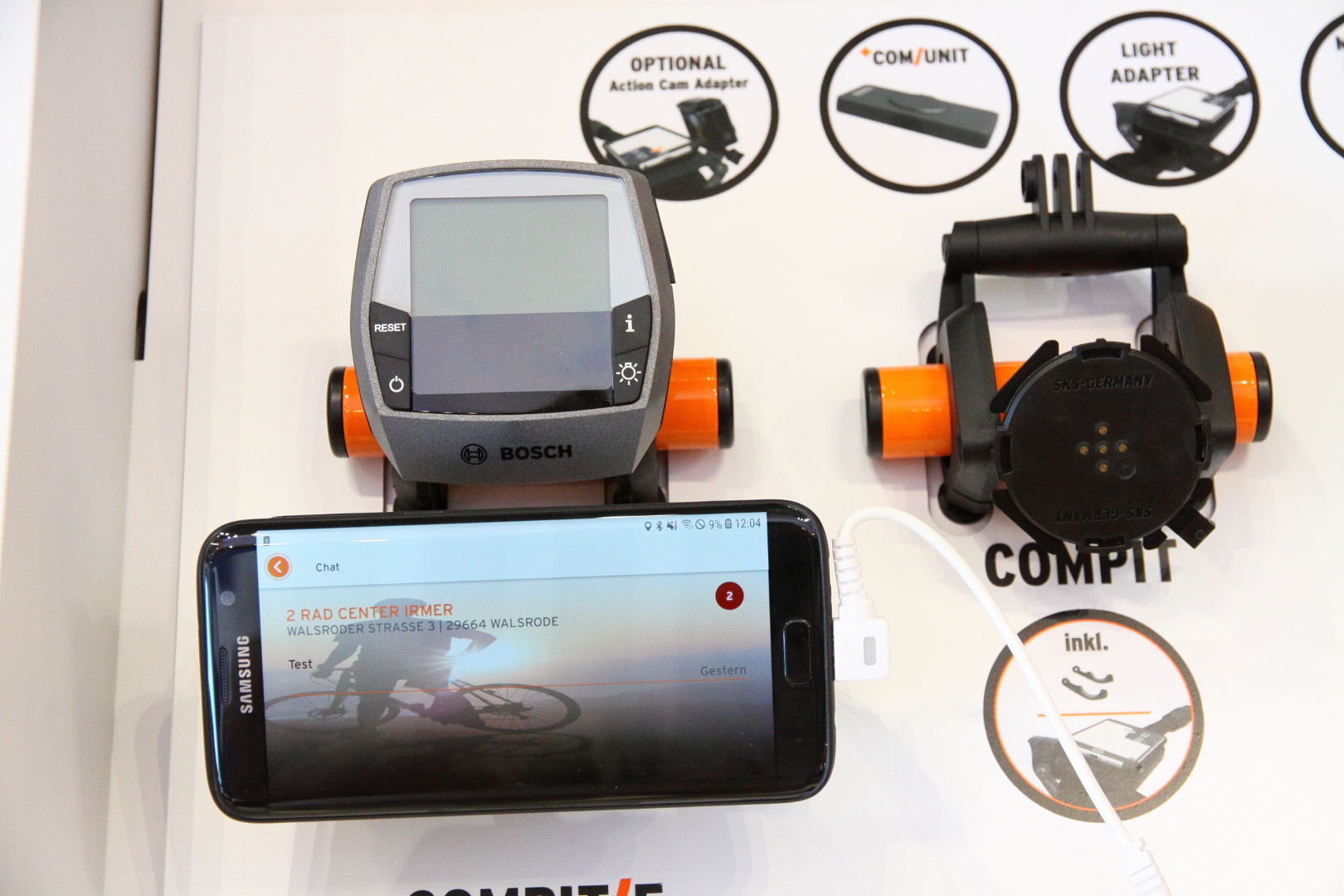 SKS Germany ist bekannt für hochwertige Luftpumpen, Schutzbleche, Werkzeuge und weiteres Zubehör. Auf der Eurobike 2018 präsentierte SKS neben einer Reihe neuer Satteltäschchen (Racer) eine interessante Smartphone Halterung fürs E-Bike. Das Smartphone und seine Vernetzungsmöglichkeiten spielen eine immer größere Rolle. Zum Beispiel als GPS-Gerät auf Biketour. Die Compit Halterung löst nicht nur das Befestigungsproblem, sondern übernimmt auch die Energieversorgung. Der Clou: Zum Set gehört auch eine Powerbank, die unter dem Smartphone sitzt. Diese wiederum wird vom Akku des E-Bikes über das (Bosch-) Display gespeist. Strom sollte also stets in Hülle und Fülle vorhanden sein. Denn das ist das Hauptproblem bei GPS-Anwendungen mit permanenter Karten-Darstellung auf dem Smartphone-Bildschirm. Compit kann aber noch mehr: An den Halter lassen sich per Adapter noch eine ActionCam und/oder ein Frontlicht montieren. Dazu gehört selbstverständlich eine App mit umfangreichen Steuerungsmöglichkeiten.