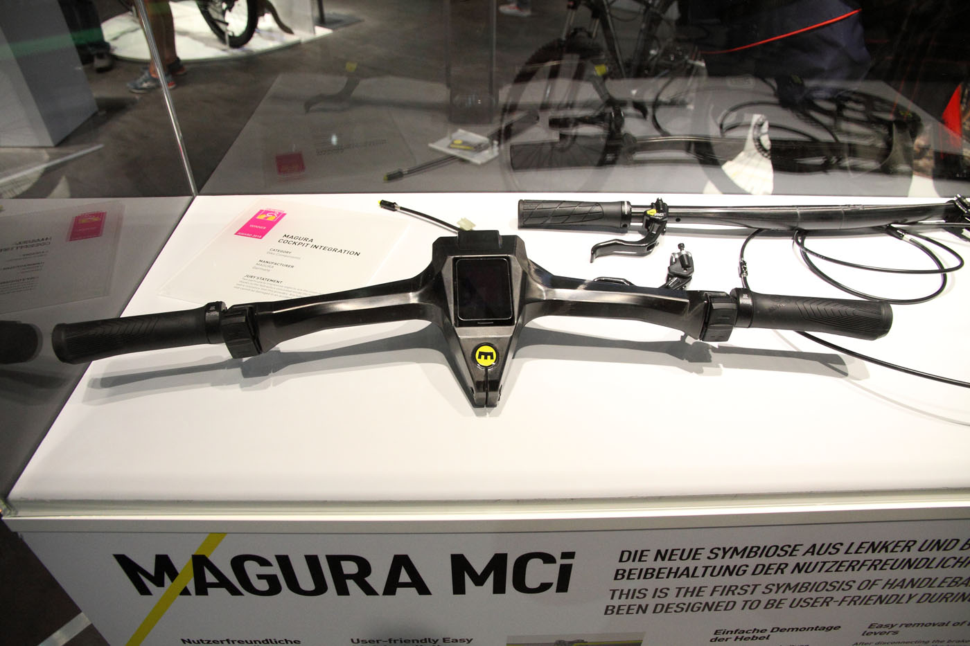 Das nennt man ein aufgeräumtes Cockpit! Die schwäbische Bremsenschmiede präsentierte mit dem MCi System die erste, vollständig in den Lenker integrierte Hydraulikbremse. Zu sehen ist lediglich der filigrane MCi Bremshebel. Die Hydraulikleitungen verlaufen im Lenker zur Mitte und anschließend durch Vorbau und Rahmen zu den Bremssätteln. Das sieht nicht nur smart aus, sondern schützt das Hydrauliksystem auch vor Beschädigungen, zum Beispiel bei Stürzen.