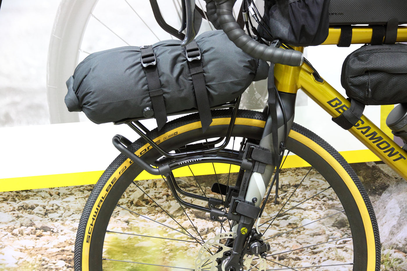 Neben einem riesigen Programm an Packtaschen und Zubehörparts aller Art präsentierte Importeur RTI ein neues Gepäckträger-System, das man auch an Rahmen ohne entsprechende Gewindeösen montieren kann. Der Tetra Rack lässt sich mit Hilfe eines Quick-Mount-Systems an den Sitzstreben oder an der Gabel befestigen. Egal, ob Fully, Hardtail oder Starrbike. Es gibt die Varianten M (1+2 für MTB) und R (1+2 für Trekking/Road/Gravel). Belastbarkeit M: 12 Kilo hinten, 10 Kilo vorne. R: 9 Kilo, 7 Kilo vorne.