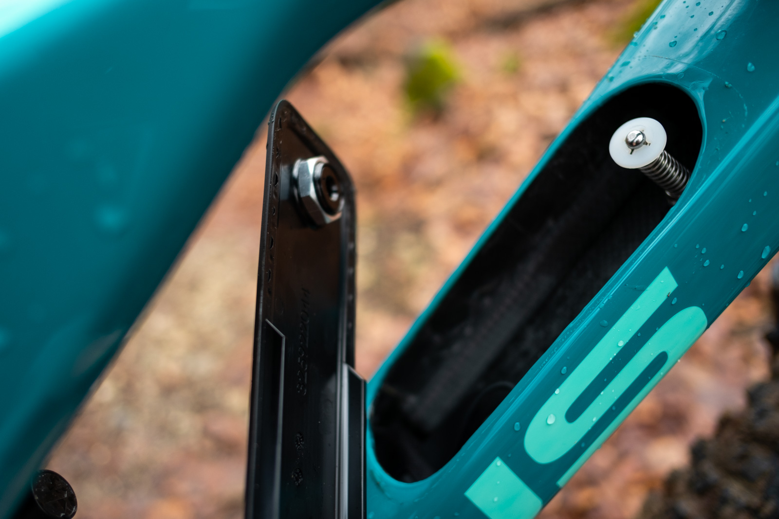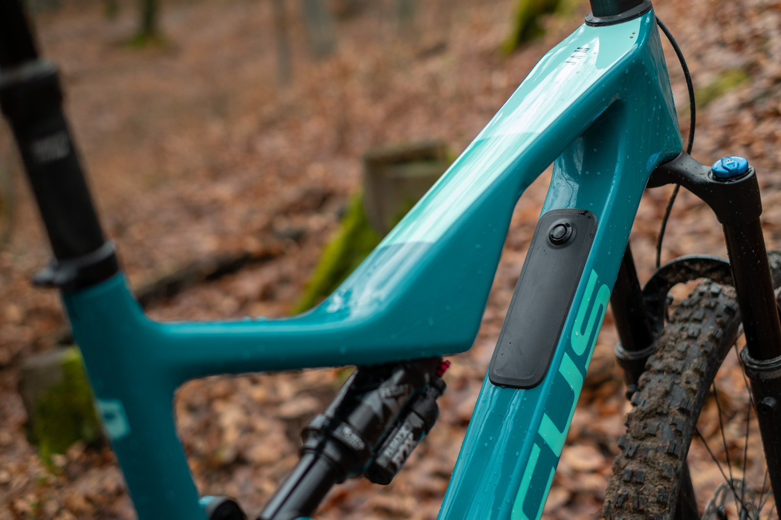 Auf der Oberseite des Unterrohrs findet sich eine kleine Abdeckung, die mittels Druckverschluss gesichert ist. Unter dieser Abdeckung befindet sich ein Staufach, in dem Kleinteile und Snacks verstaut werden können (die I.C.S.). Eine im Lieferumfang enthaltene Tasche sichert das Gepäck und verhindert Klappergeräusche. Dieses Feature findet man immer häufiger. So ein Staufach ist ein echter Pluspunkt für Biker*innen, die gerne auf einen Rucksack oder eine Hip-Bag verzichten möchten und so viel Equipment wie möglich am oder im Bike transportieren wollen. Ein Multitool, Ersatzschlauch, Minipumpe und ein paar Riegel finden Platz in dem Staufach. Die Positionierung des I.C.S. ist allerdings nicht ganz optimal. Durch die Öffnung recht weit oben auf der Oberseite des Unterrohrs ist es schwierig, die längliche Tasche gerade in das Unterrohr einzuführen. Mit einer durchdachten Befüllung versehen, lässt sich die Tasche etwas verformen und dann klappt das Ganze gut.
