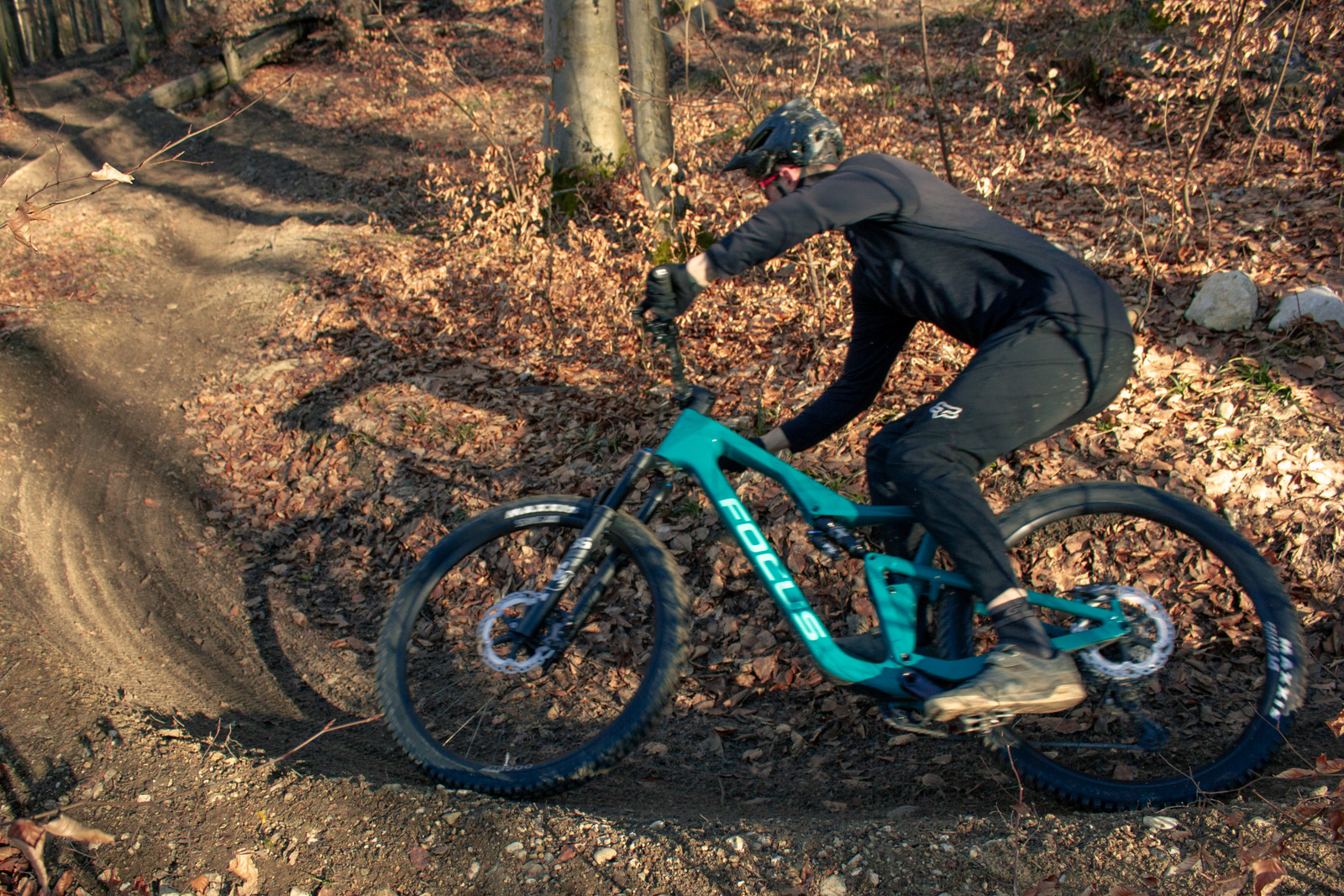 Mehr Skalpell als Monstertruck. Die 150 mm Federweg am Jam sind zwar nicht gerade wenig, allerdings fühlt sich das Bike deshalb nicht wie ein Sofa an, das über alles hinwegbügelt und am Boden klebt. Der Hinterbau bietet eine überraschend gute Mischung zwischen Support gegen Ende des Federwegs und Sensibilität bei kleineren Schlägen. Die beiden Fox-Federelemente harmonieren sehr gut im Focus und bieten trotz weniger Einstellmöglichkeiten eine gute Balance. Damit lässt sich das Jam leicht vom Boden poppen und fördert einen aktiven Fahrstil. Die scharfe Geometrie mit 65° Lenkwinkel und kurzen 435 mm Kettenstreben unterstützt dieses Fahrgefühl weiter. Das Bike lenkt schnell ein und fühlt sich verspielt an, agiert schnell bei Richtungswechseln und lässt sich leicht über den Trail bewegen.