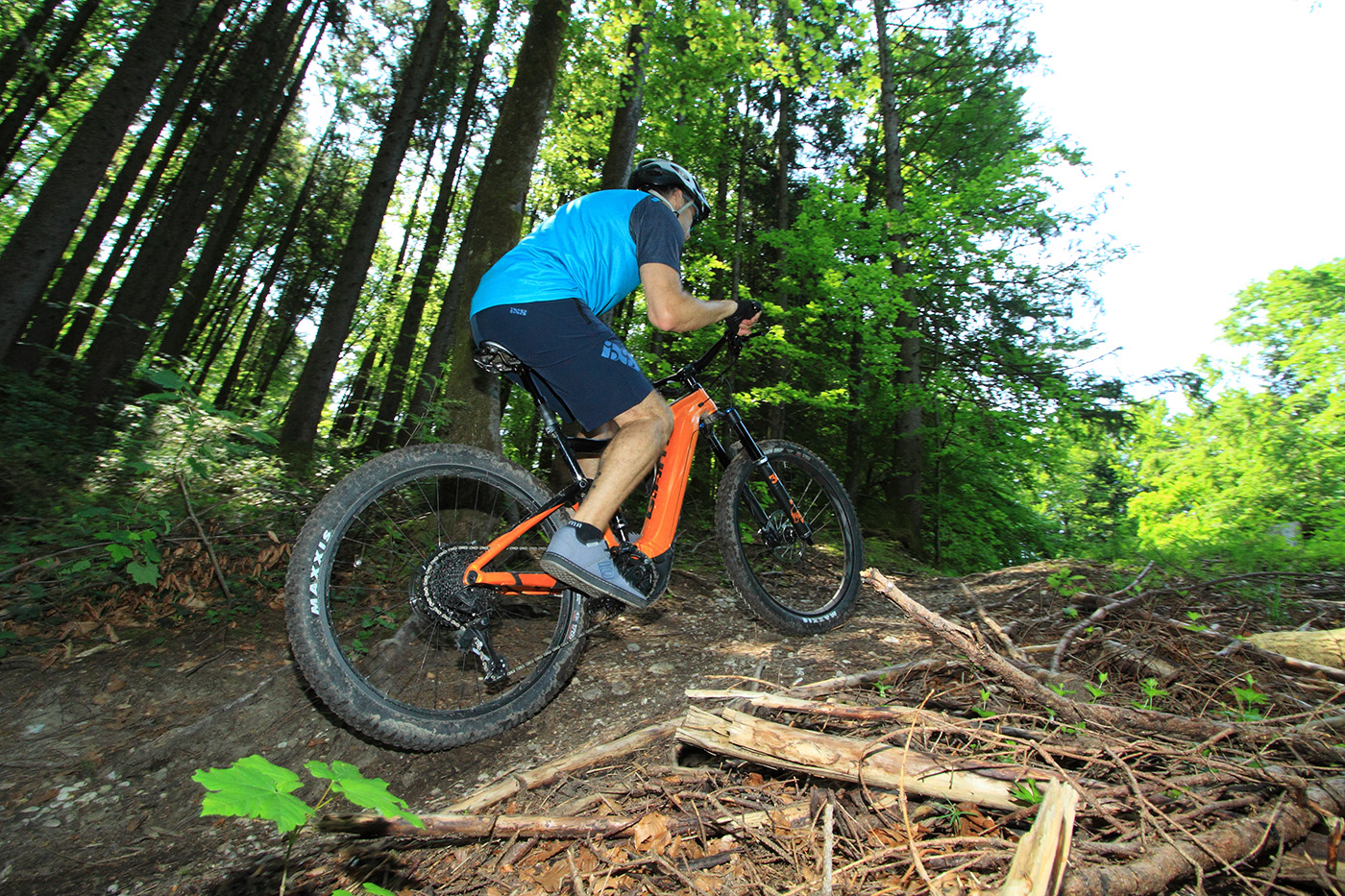 Bevor es los geht darf man nicht vergessen, die blauen Hebel an Gabel und Dämpfer in die Stellung „Open“ zu bringen. Damit spricht das Fahrwerk sensibel an und es steht der volle Federweg zur Verfügung. Man spürt sofort: Bergab ist das Trance E+ in seinem Element. Dank des tiefen Schwerpunktes liegt das Fahrwerk unglaublich satt auf dem Trail. Bockige Wurzelpassagen werden einfach glatt gebügelt. Einmal mehr spielen die fetten Reifen ihren Komfort-Bonus aus. Der breite Lenker lässt dich stets die volle Kontrolle über die gewählte Fahrlinie behalten. Und wenns knifflig wird kannst du mit einem Hebeldruck die Sattelstütze versenken. Die Bremsen beißen energisch zu, es kommt nie Zweifel daran auf, rechtzeitig zum Stehen zu kommen. Einziger Kritikpunkt auf steilen Bergab-Passagen bleibt die etwas niedrige Front, geschuldet dem kurzen Steuerrohr des Rahmens.