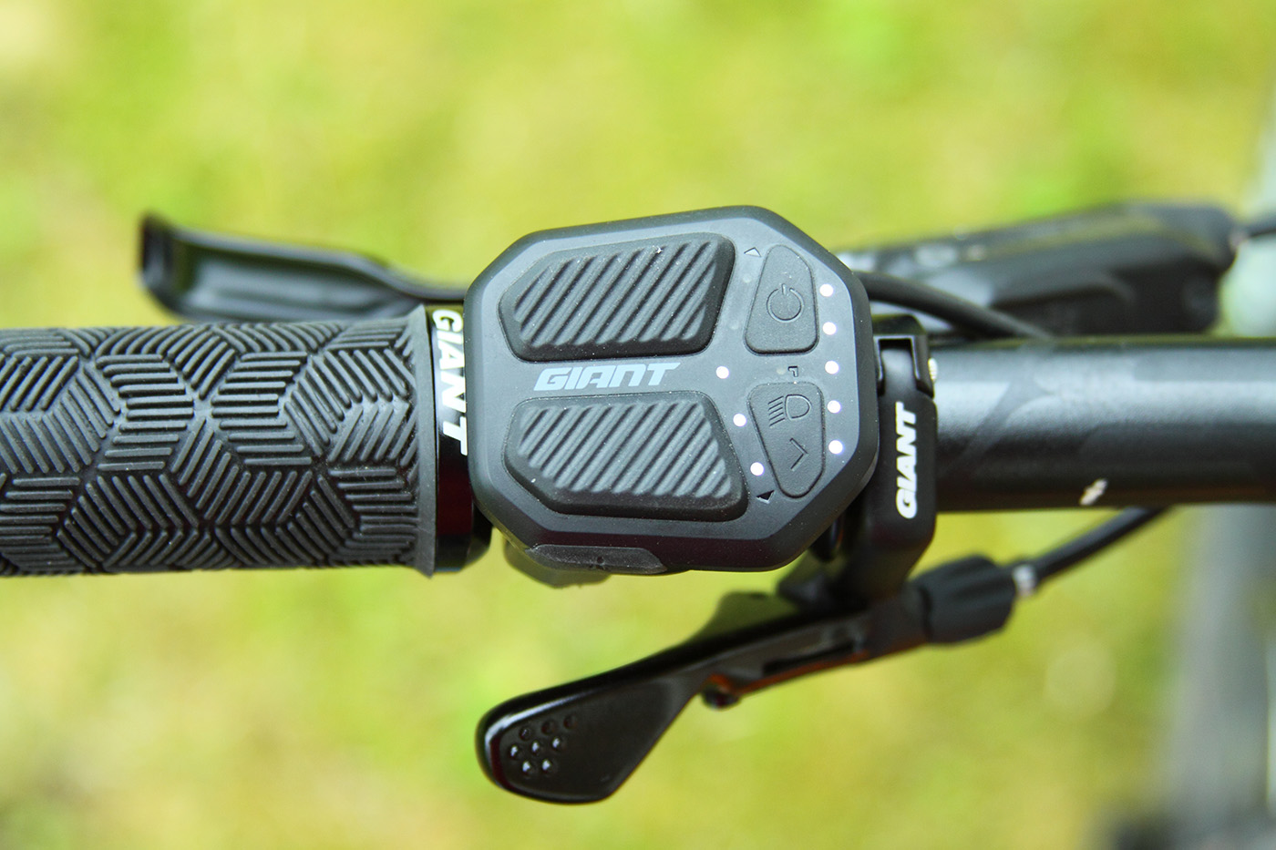 Wer bereits Erfahrung mit E-Bikes hat wird sich vielleicht darüber wundern, dass es am Trance E+ 1 Pro kein Display mit Bildschirm in der Mitte des Cockpits gibt, sondern lediglich ein geradezu winziges Bedienteil am linken Lenkergriff. Es besitzt je einen Aufwärts- und Abwärts-Taster für die Motor-Modi, einen seitlichen Taster für die Schiebehilfe, einen Ein-Aus-Schalter (Hauptschalter) sowie einen Taster für (optionale) Beleuchtung. Dazu kommen zwei 5-stellige LED-Reihen: Eine zeigt den aktiven Unterstützungsmodus und eine zeigt den Akku-Ladestand. Die komplette Oberfläche ist gummiert für optimalen Grip und als Schutz gegen Spritzwasser.