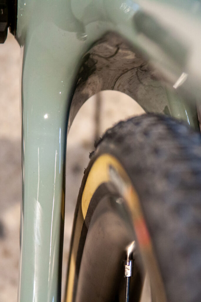 Die maximale Breite der Reifen an deinem Gravelbike begrenzen der Hinterbau des Rahmens und die Gabelscheiden. Zu diesem Wert gibt es in der Regel eine Herstellerangabe, also beispielsweise 48 Millimeter. Die weiteren Möglichkeiten: Ausprobieren oder selbst nachmessen zwischen Kettenstreben, Sattelstreben und Gabelscheiden. Wobei man letztendlich mit dem Reifen nicht bis auf Haaresbreite an diese Bauteile heran gehen sollte. Zum einen verformt sich das Laufrad geringfügig in manchen Fahrsituationen. Zum anderen kann Schmutz eine Kruste auf dem Profil bilden, die entsprechend einige Millimeter dick aufträgt. Unser Tipp: Mindestens 4 Millimeter Spielraum zwischen Reifen und Rahmen lassen.