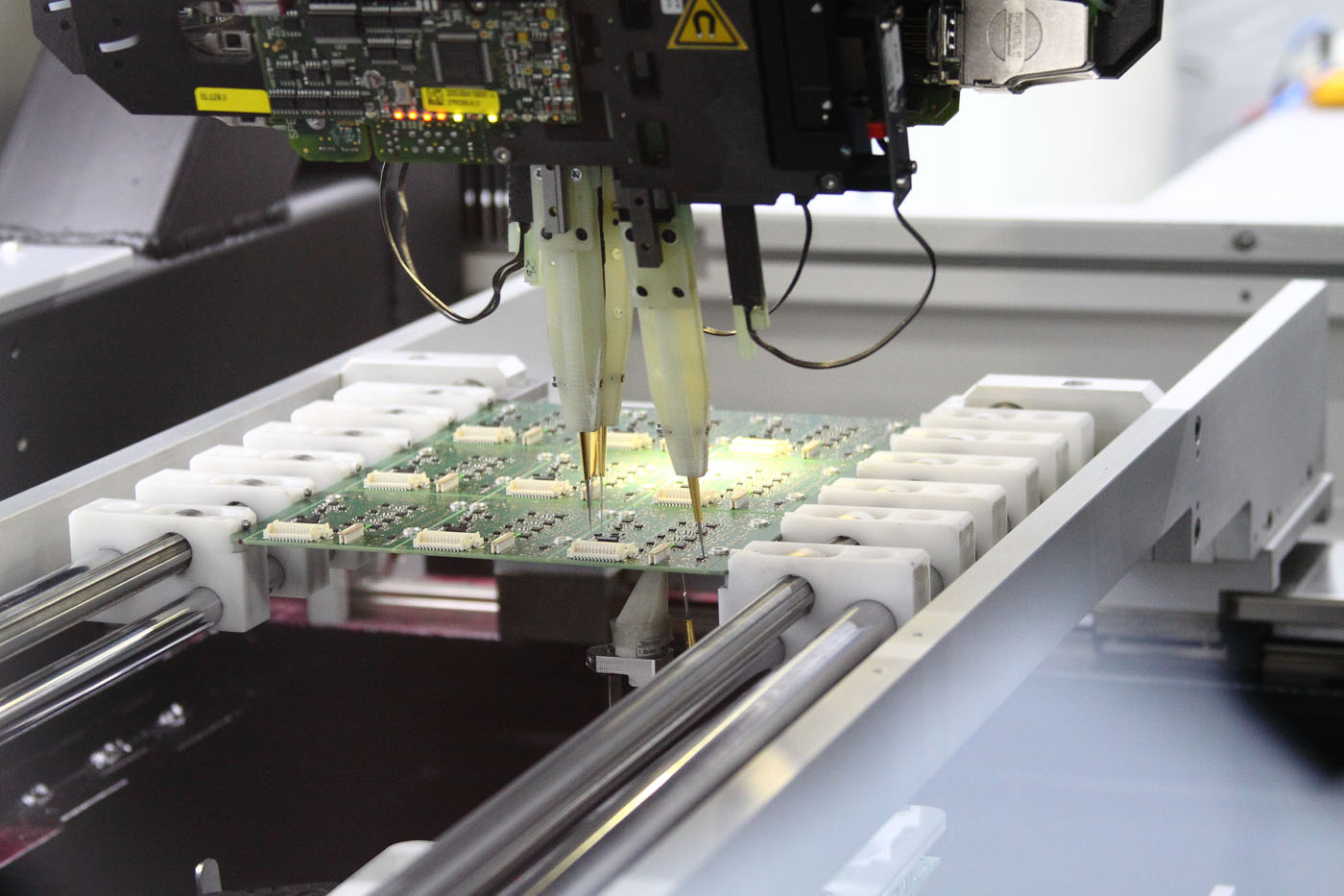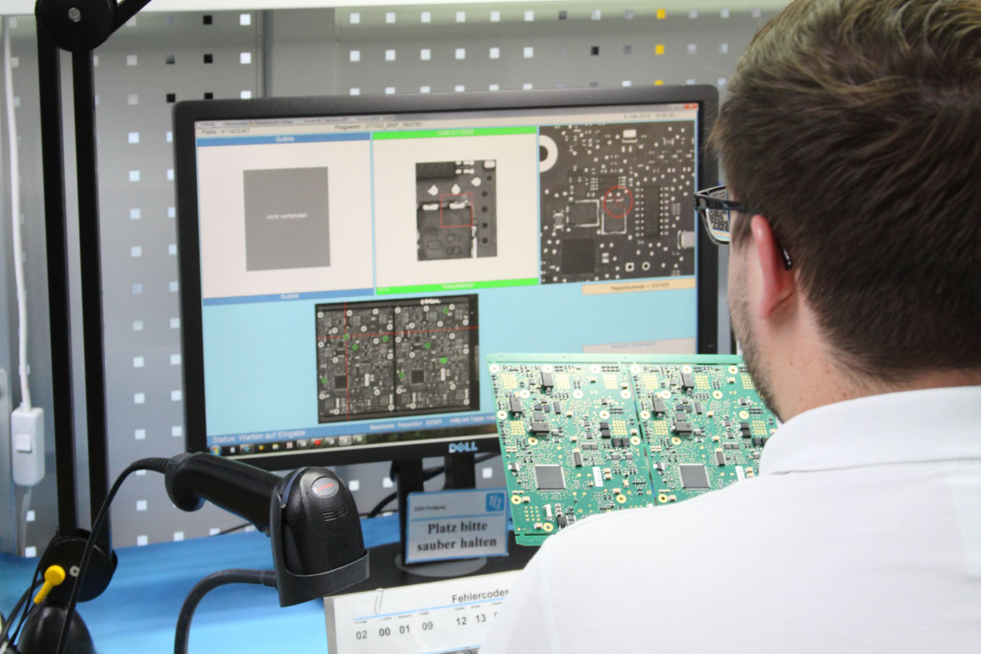 Aber nicht alles läuft bei der Fertigung vollautomatisch. ArbeiterInnen schauen durch Mikroskope und checken verschiedene Platinen stichprobenartig. An anderen Plätzen werden Schaltungen am Bildschirm kontrolliert. Bis zum Einbau in den Motor durchläuft eine Platine etliche Qualitätskontrollen. „Höchster Qualitätsstandard ist das oberste Gebot bei TQ-Systems“, sagt Simon Hoffmann. „Das Zertifikat zur Herstellung von Bauteilen für die Luft- und Raumfahrt erhält schließlich nicht jeder.“