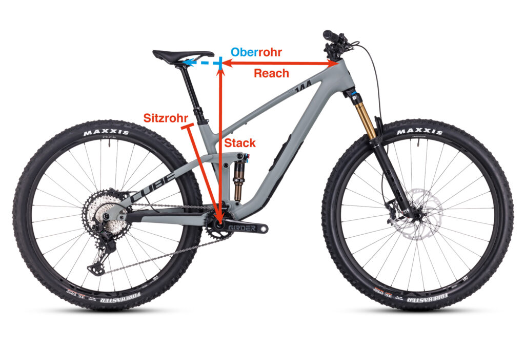 Früher konnte man sich einfach an der Sitzrohrlänge orientieren. Seit jedoch die meisten Rahmen ein stark nach hinten abfallendes Oberrohr besitzen, ist dieses Maß weniger relevant. Deshalb wurden zwei neue, aussagekräftigere Maße eingeführt: Stack und Reach. Diese geben in Kombination Aufschluss darüber, ob die Sitzposition eher sportlich oder eher komfortabel ist.
