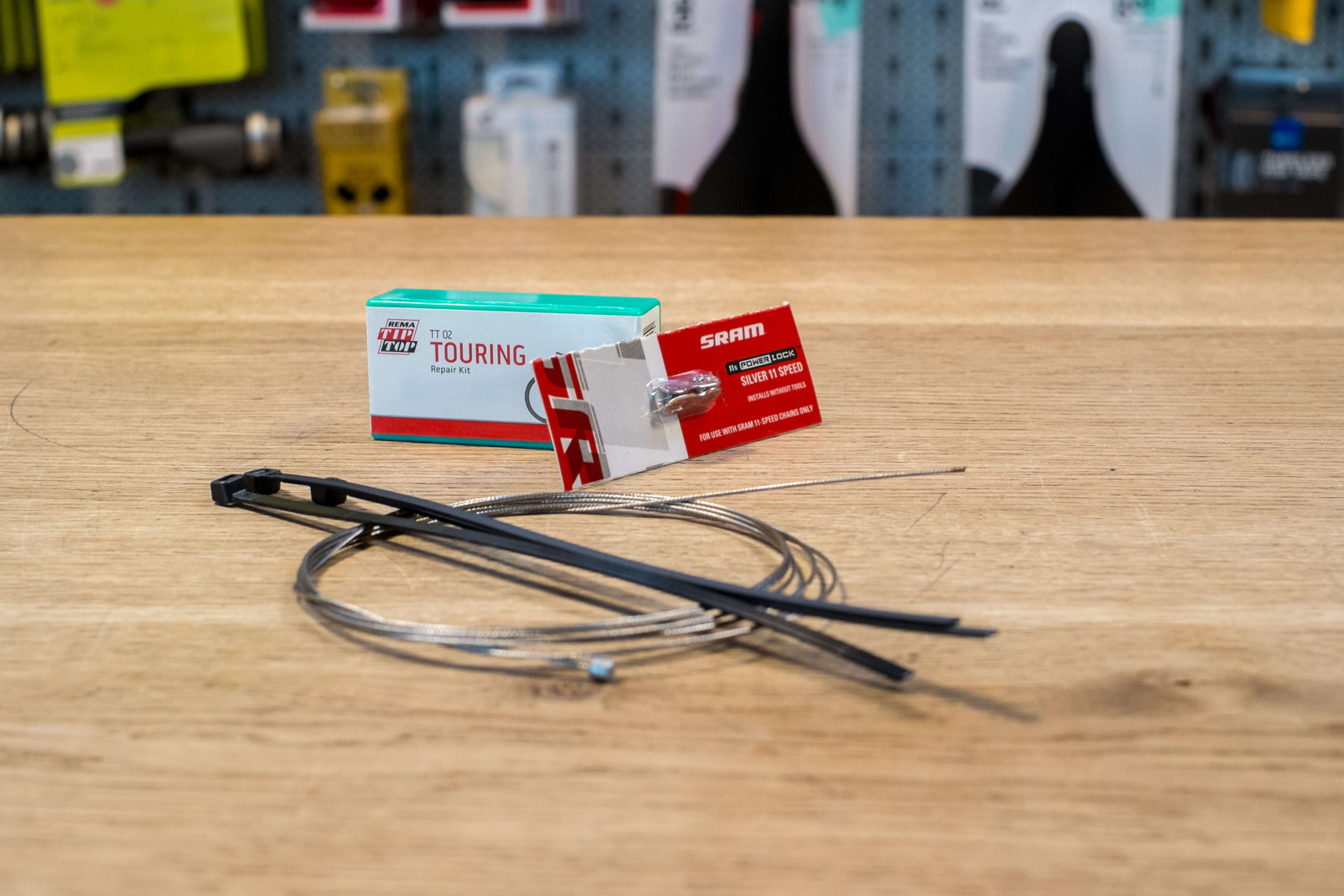 Ein oben genanntes Kettenschloss, Kabelbinder, Flickzeug und ein extra Schaltzug vervollständigen das Notfallset. Kabelbinder bändigen lockere Züge am Rad, das Flickzeug dichtet den Schlauch im Falle eines zweiten Plattens ab und der Schaltzug wird erneuert, wenn einer am Rad reißen sollte.