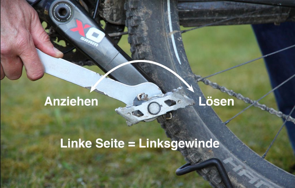 Auf der linken Seite sind die Dreh-Richtungen auf Grund des Linksgewindes vertauscht! Anziehen GEGEN den Uhrzeigersinn, lösen IM Uhrzeigersinn (LINKS-Gewinde). Auch hier gilt wieder: Zuerst das Pedal von Hand eindrehen und am Ende mit dem Schlüssel arbeiten. Von oben her arbeiten ist bequemer: Dazu die Kurbel beim Anziehen auf etwa 4 Uhr stellen, beim Lösen auf 8 Uhr.