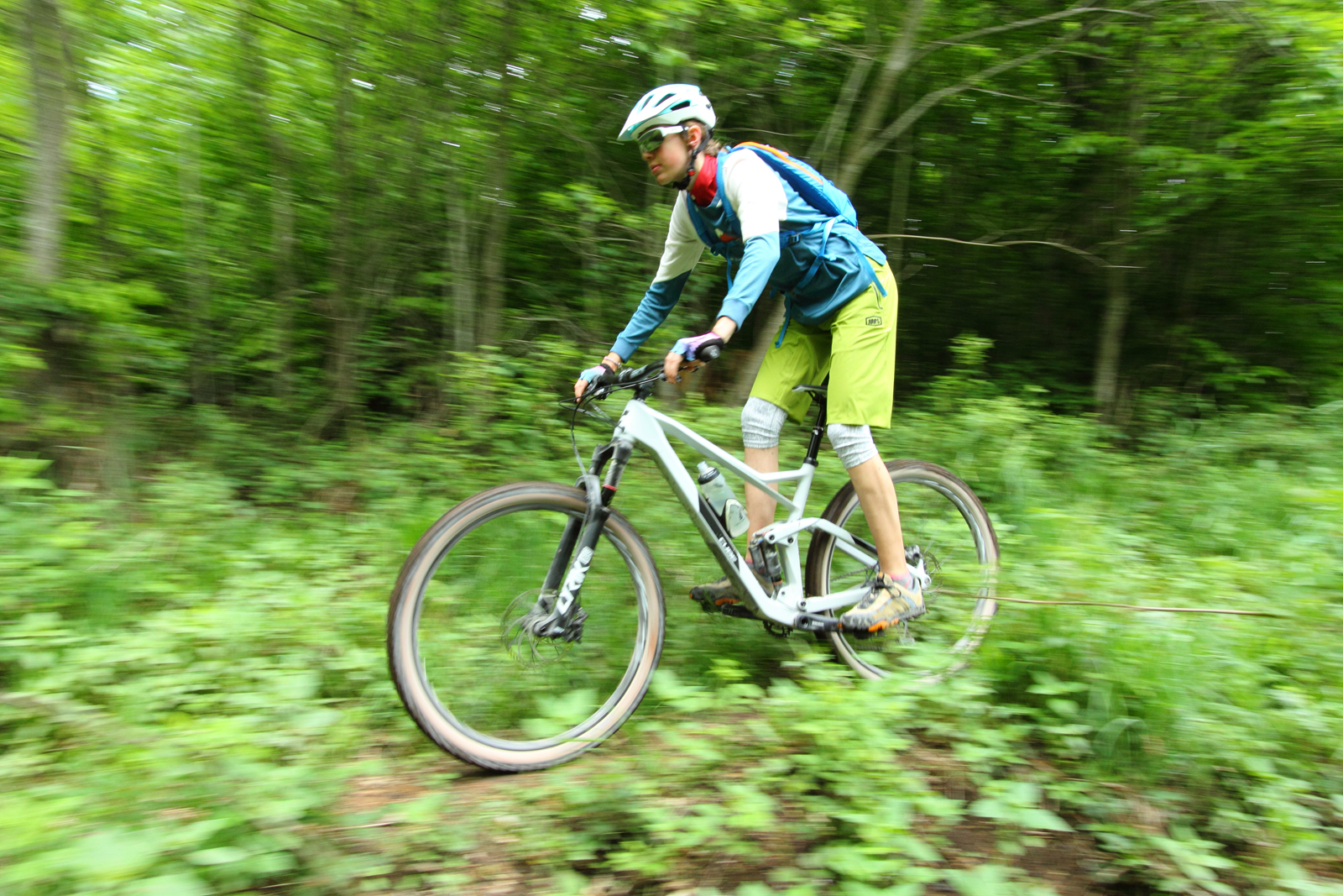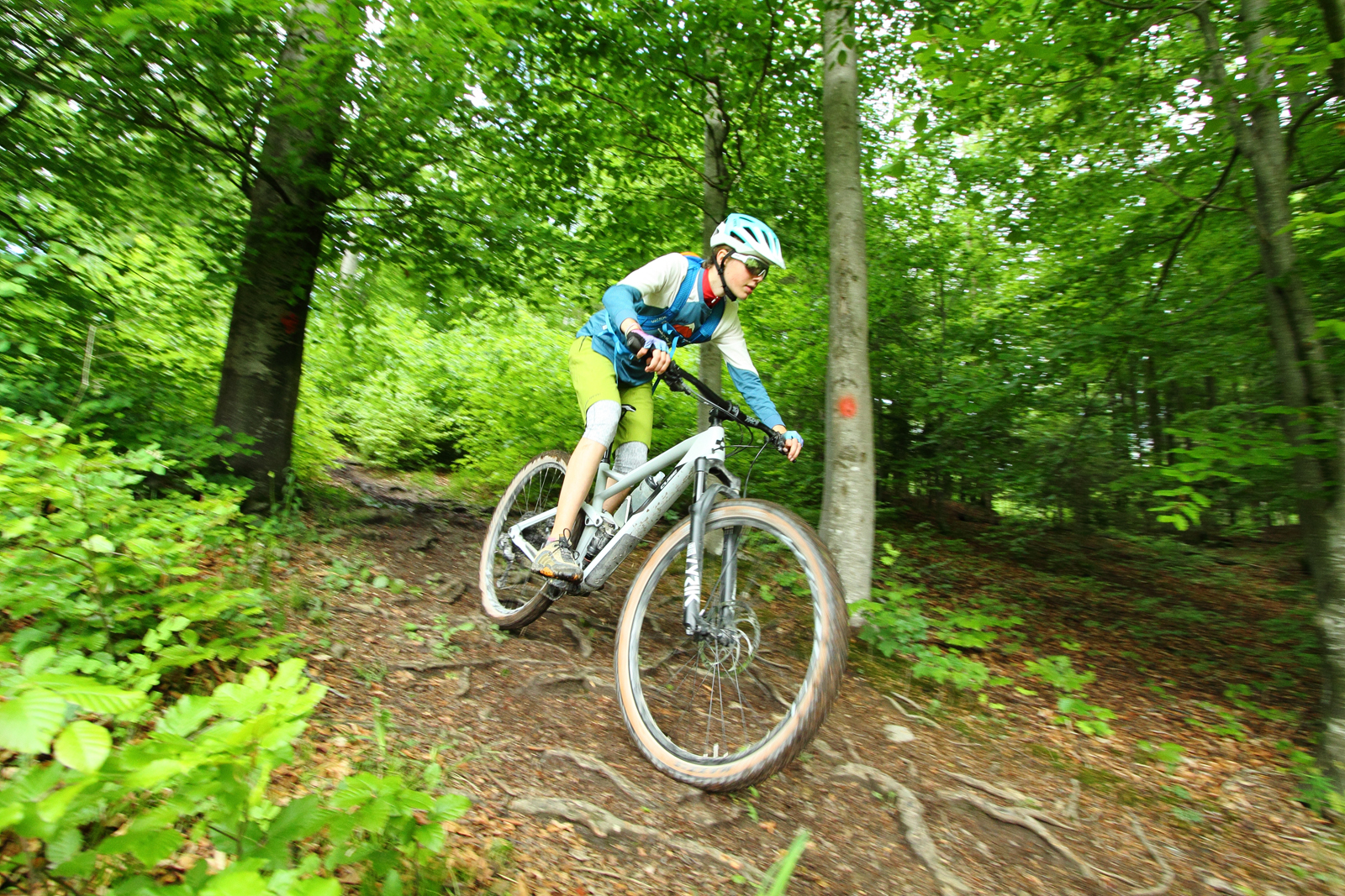 Endlich heißt es: Sattelstütze runterfahren und Bremsen los! Wie schlägt sich das Stereo 150 in seiner Paradedisziplin? Der Anfang ist schonmal perfekt, denn mit der hauseigenen Dropper Post ist eine Teleskop-Sattelstütze serienmäßig dabei. Soviel zum Thema „durchdachte Ausstattung“. Sobald man in den ersten Trail einbiegt, die ersten Hindernisse überrollt und Stufen hinunter poltert, fügt sich alles zusammen. Fahrer, die bislang vielleicht ein Tourenbike mit 120 oder 130 Millimeter Federweg unter dem Hintern hatten, werden das Grinsen nicht mehr aus dem Gesicht bekommen. Dank der 29er Laufräder und des potenten Fahrwerks bügelt das Enduro jede Rüttelpiste glatt. Man muss aufpassen, nicht übermütig zu werden. So viel Sicherheit vermittelt dieses Fully. Das Fahrwerk arbeitet selbst beim niedrigen Gewicht der Testfahrerin sensibel, der Federweg wird optimal ausgenutzt.