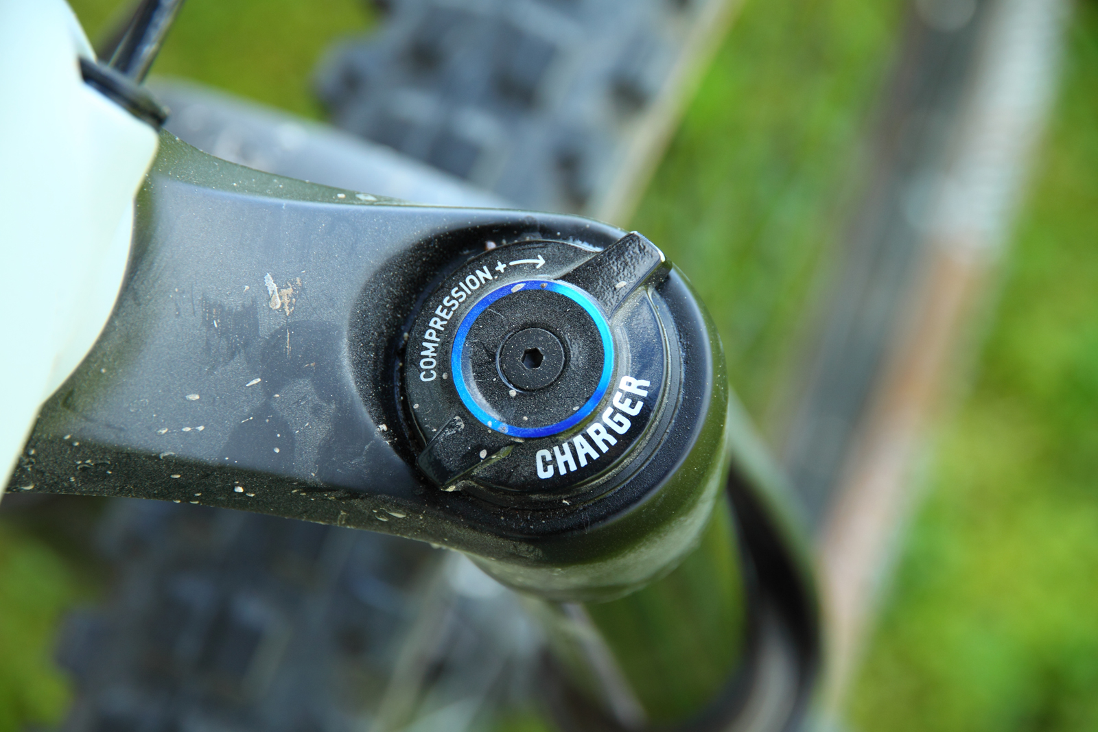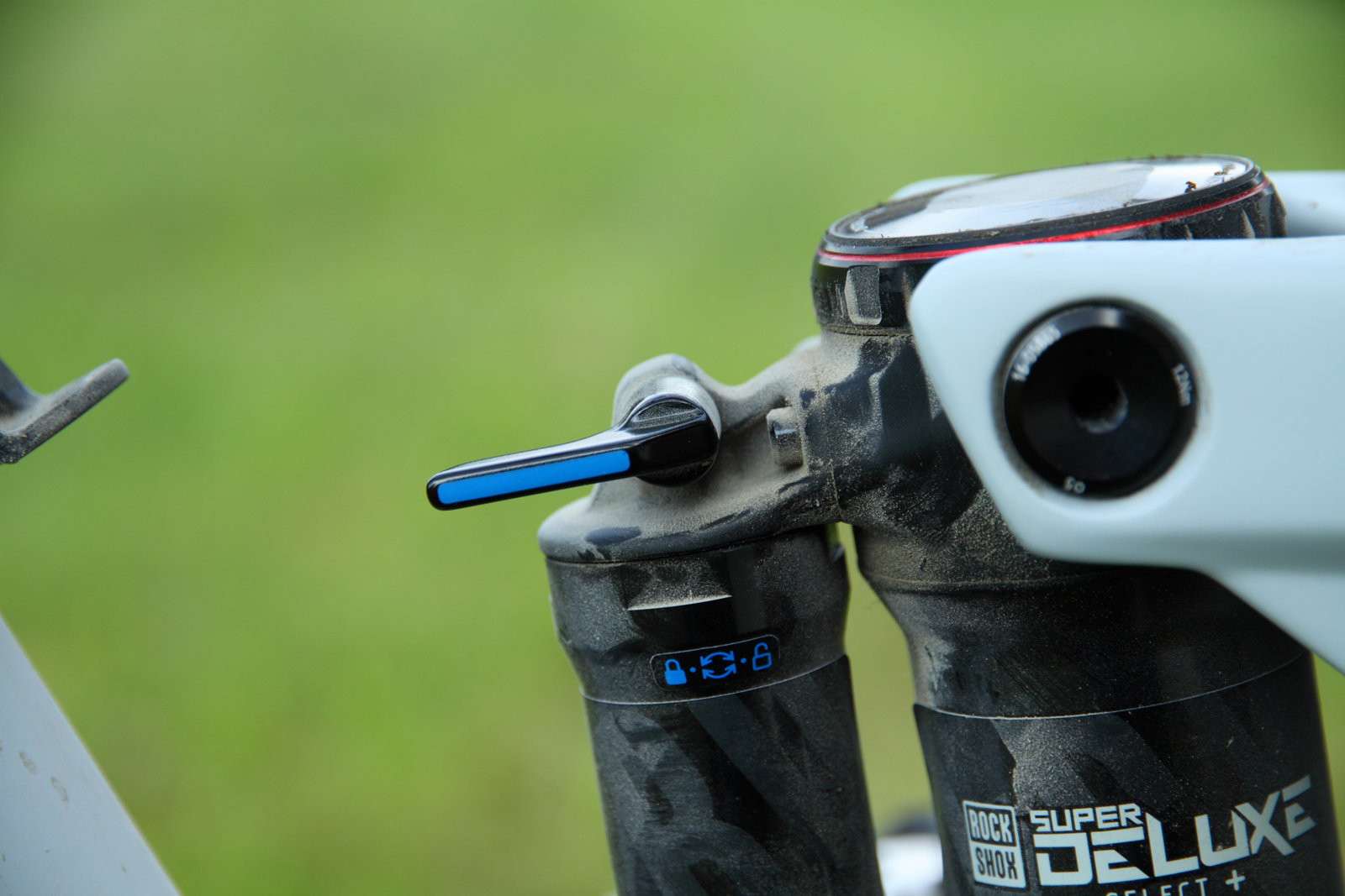 Am Dämpfer befindet sich seitlich ein kleiner blauer Hebel mit zwei Positionen. Nach hinten gelegt arbeitet der Dämpfer ganz normal und kann bei einem Hindernis blitzschnell den gesamten Hub (Federweg) zur Verfügung stellen. Die richtige Position für technische Trails, grobes Gelände und vor allem Abfahrten. Schätzungsweise wird man 70 bis 80 Prozent der Fahrzeit mit offenem Dämpfer unterwegs sein. Legt man den Hebel aber nach vorne, federt der Hinterbau spürbar zäher ein und reagiert kaum auf Tretbewegungen des Fahrers. Ideal zum Beispiel auf längeren Forstweg-Auffahrten. Es ist aber kein LockOut (Blockierung)! Auch an der Gabel lässt sich die Druckstufe (Compression) erhöhen, so dass sie zäher einfedert. Aber Achtung: Man sollte nur nicht vergessen, die Federung am Ende des Anstiegs wieder zu öffnen!