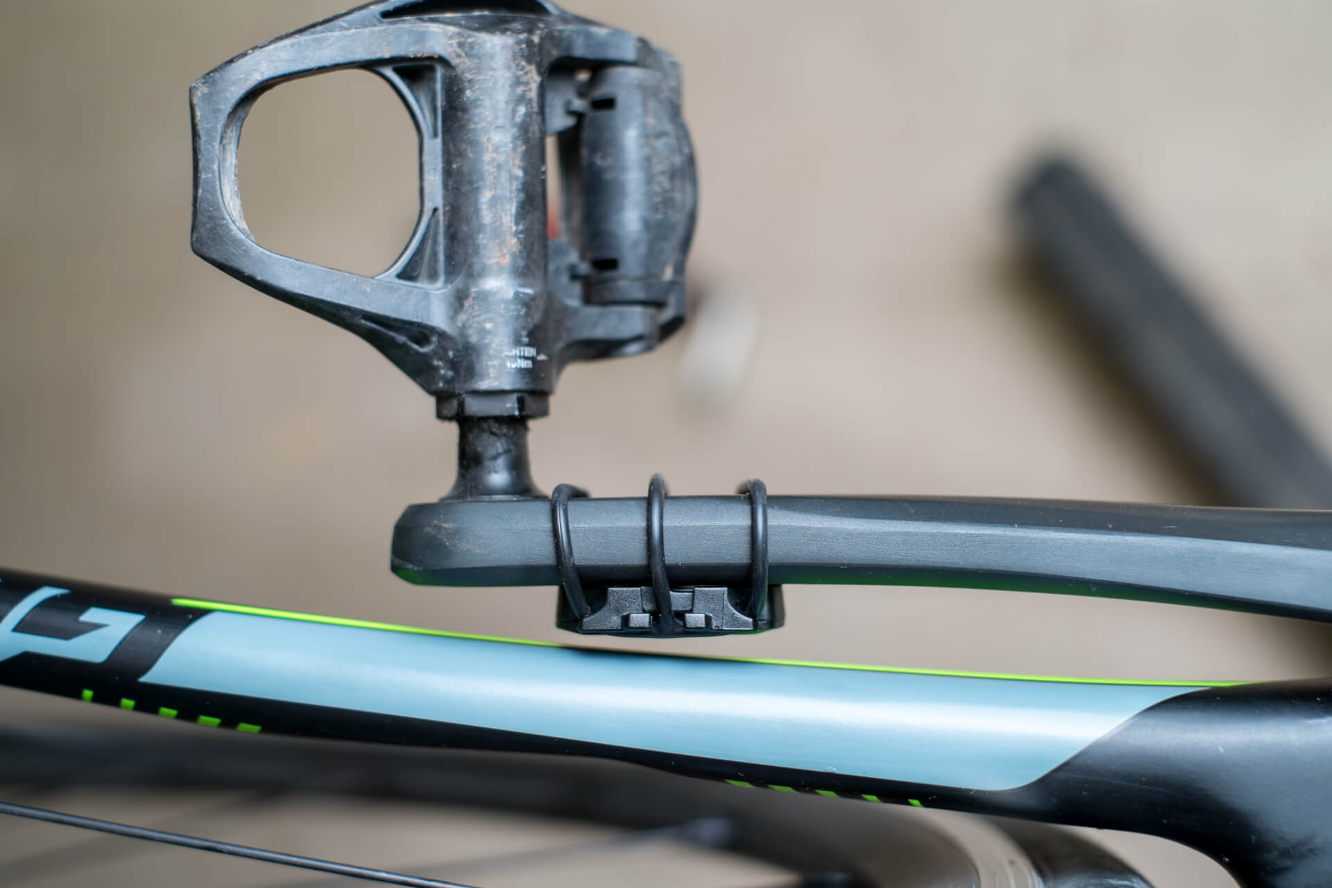 Mit einem der drei beiliegenden Gummis lässt sich der Trittfrequenzsensor an jeder Kurbel anbringen. Hier sollte noch beachtet werden, dass der Sensor nicht die Kettenstrebe des Rahmens berührt und der Schuh nicht am Befestigungs-Gummi schleift, um ein Beschädigen oder Verlorengehen des Sensors zu vermeiden.