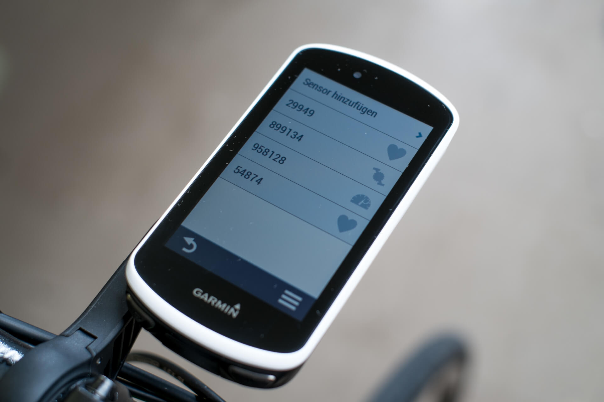 Um die Sensoren mit dem Navigationsgerät zu verbinden, müssen sie aktiviert werden. Drehe also das Rad mit dem montierten Geschwindigkeitssensor und die Kurbel ein paar Umdrehungen um die Sensoren aus dem Schlafmodus zu holen. Damit der Herzfrequenzsensor aktiviert wird, musst du diesen einfach anlegen. Die aktiven Sensoren werden vom Garmin Edge schnell erkannt und können dann verbunden werden.