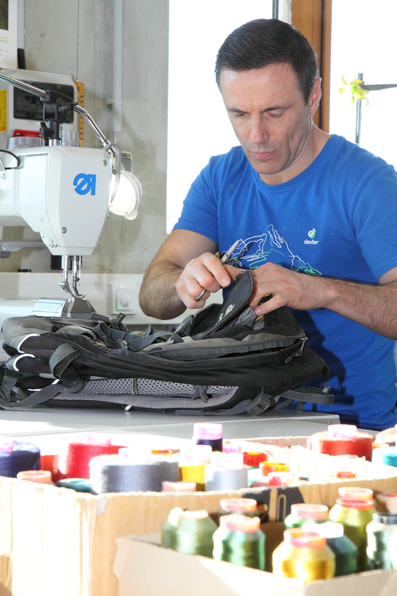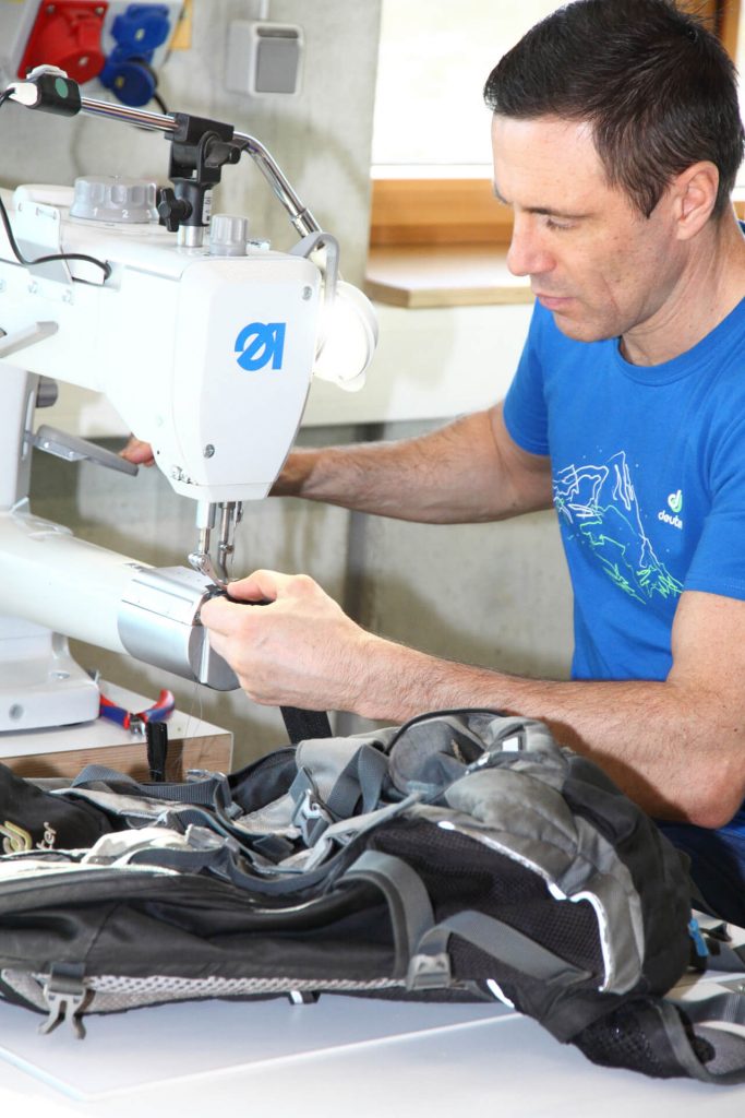 Auf dem Weg vom Empfangsbereich in die heiligen Hallen passieren wir die Näherei mit dem Reparaturservice. Hier landen alle Deuter Produkte, die von Endkunden über einen Händler zur Reparatur eingeschickt werden. Wie schauen Eugen auf die Finger, der gerade einen Rucksack unter die Nadel seiner Nähmaschine schiebt. Es sieht in diesem Fall zwar nicht nach einem ernsthaften Schaden aus, aber Eugen weiß bei jedem Produkt genau wo der Faden hingehört. Martin erklärt: „Deuter gibt für seine Produkte ein lebenslanges Reparaturversprechen. Damit wollen wir den Kunden auch klar machen, dass man bei einem Schaden nicht jedes Teil gleich entsorgen muss.“