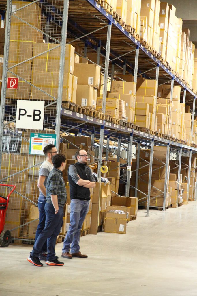 Schier endlose Gänge und Kartons soweit das Auge reicht im Hochregallager des Deuter Logistikzentrums