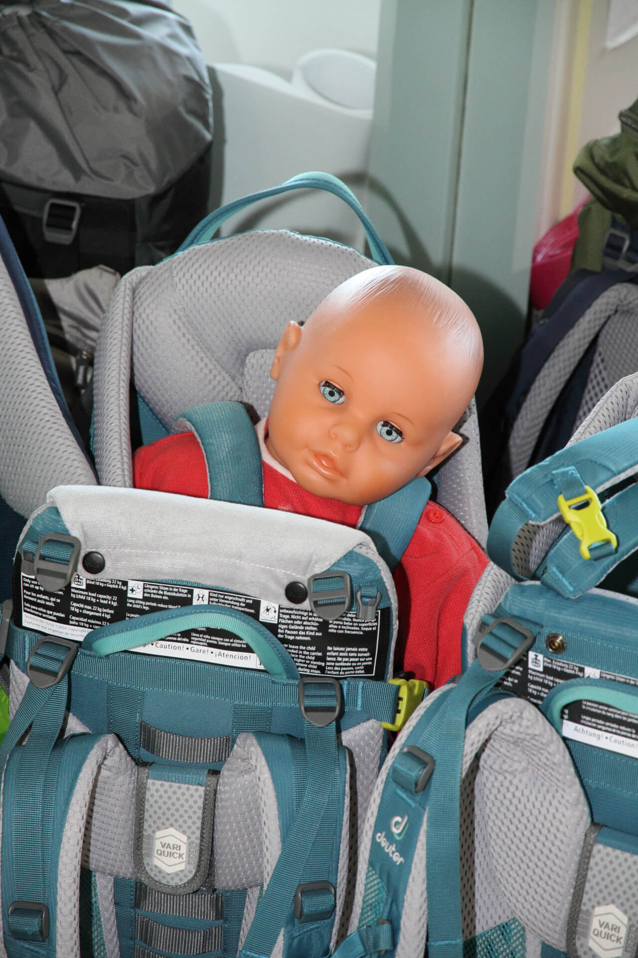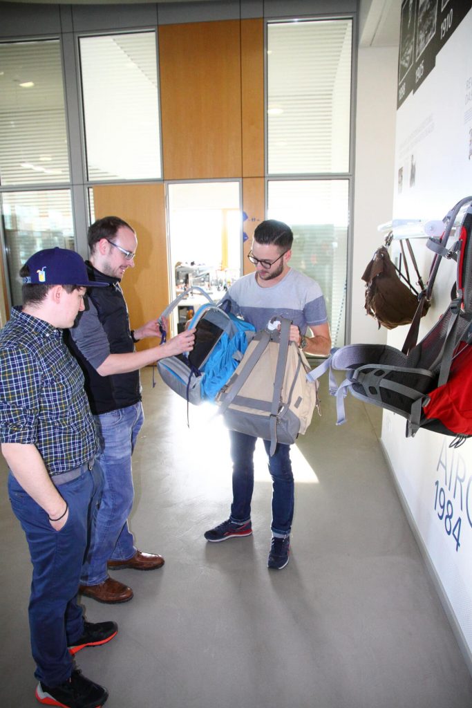 Wir verlassen die Hallen wieder und durchstreifen die Büro-Etagen. Tageslicht flutet durch großzügige Glasfronten in die Büros und weiter durch Glaswände in das gesamte Gebäude. Mitarbeiter stehen zusammen, diskutieren, oder sitzen komzentriert an ihren Schreibtischen. Es herrscht eine entspannte aber dennoch betriebsame Atmosphäre. Vor den Räumen des Produktmanagements stapelt sich ein wirrer Haufen von Produktmustern im Gang. Puppen sitzen als Test-Dummy in Kinder-Tragekraxen. Viele Teile werden stichprobenartig zerschnitten und auf ihre korrekte Fertigung geprüft. Oder es wird auf diese Weise nach Verbesserungsmöglichkeiten im Detail gesucht. Wo kann man noch Gewicht sparen? Wie lässt sich der Tragekomfort optimieren? Was kaum ein Kunde vermutet, ist der immense Vorlauf, den die Entwicklung benötigt: Im Jahr 2019 wird bereits an der Kollektion für 2021 gearbeitet.