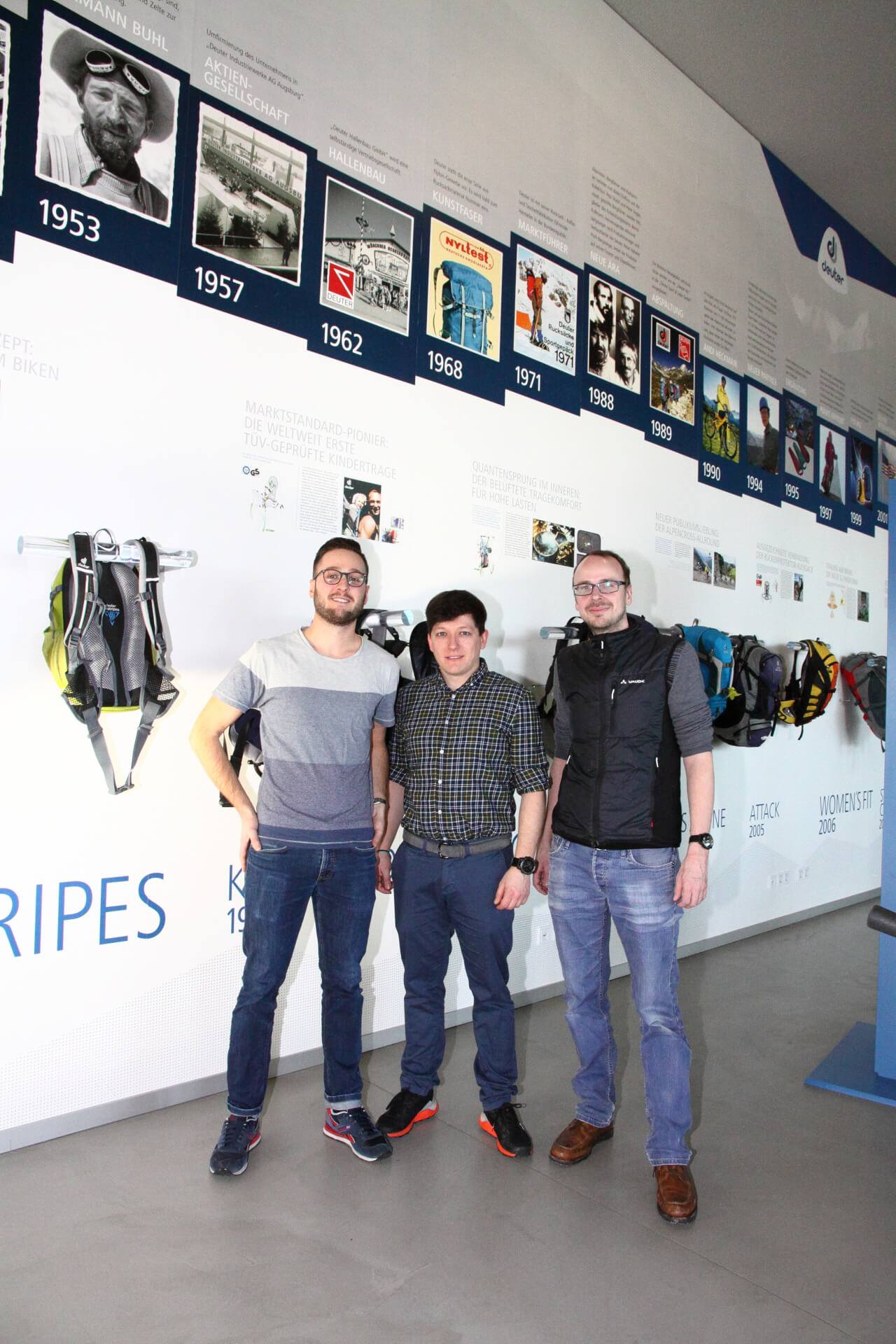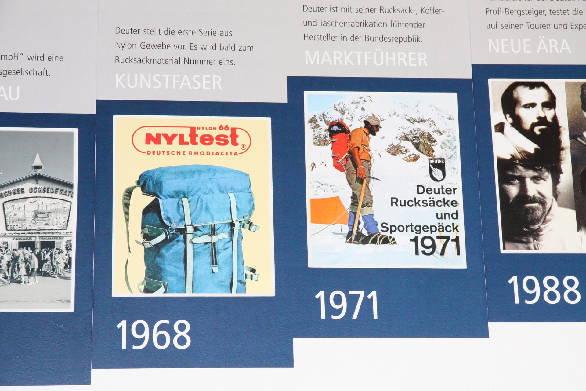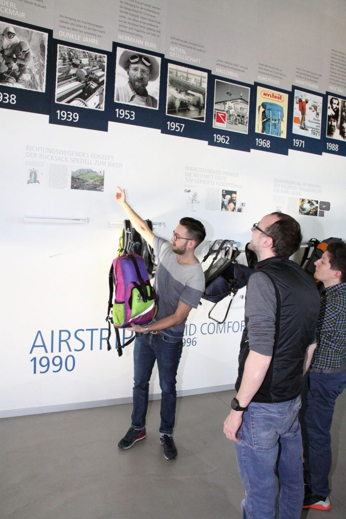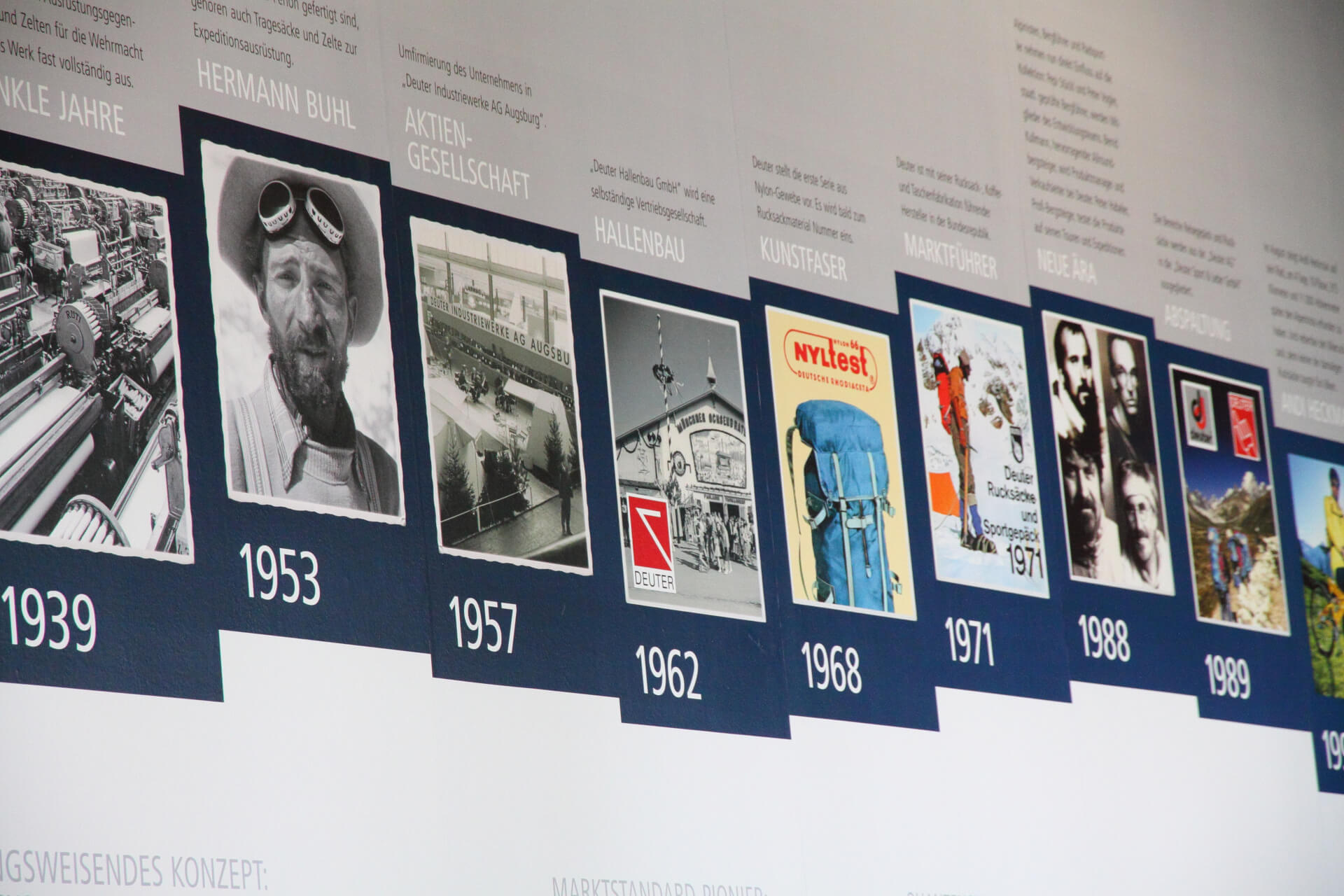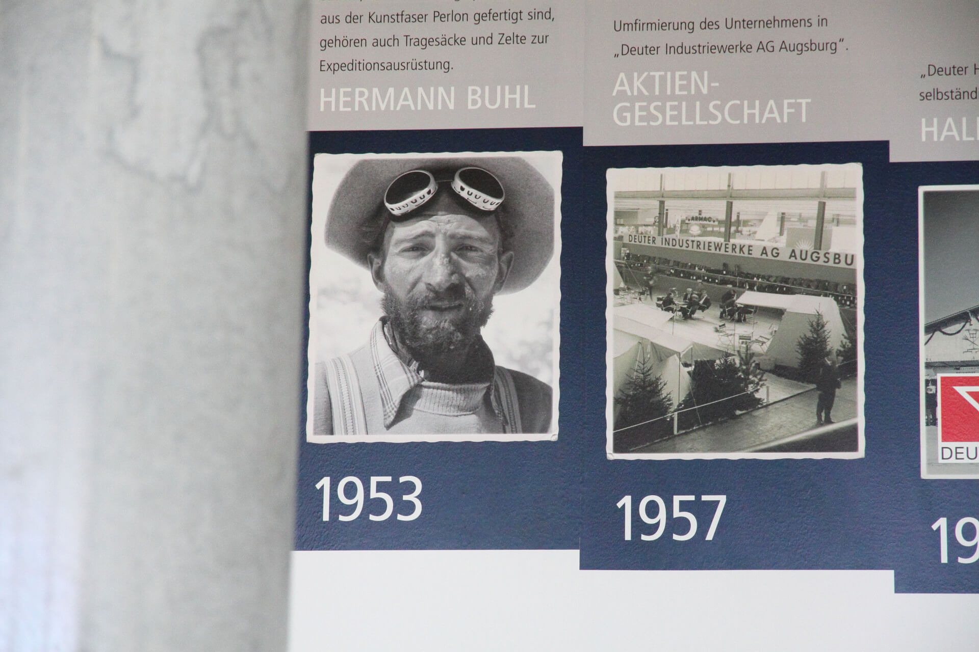 Wir stehen in der Empfangshalle des modernen Firmengebäudes, das seinen Sitz in Gersthofen hat, in der nördlichen Peripherie von Augsburg. Im Büroteil sind Vertrieb, Marketing und die Entwicklungsabteilung beheimatet. In den direkt angrenzenden Hallen befinden sich das Lager und die Logistik. Rund 100 Mitarbeiter sind alleine hier in Gersthofen damit beschäftigt, die Marke Deuter im Weltmarkt zu platzieren. Hinzu kommen über 4000 Mitarbeiter in Vietnam, wo die Produkte seit 1993 hergestellt werden. Unser Guide Martin Zanker, seines Zeichens Verkaufsleiter der Sparte Bike, lässt sich noch kurz entschuldigen. Aber bei Deuter kann selbst im Wartebereich keine Langeweile aufkommen. Denn eine Art Ahnengalerie, gespickt mit Produkten, Werbeplakaten und Statements prominenter Bergsportler nimmt Besucher mit auf eine Zeitreise durch mehr als 100 Jahre Firmengeschichte.