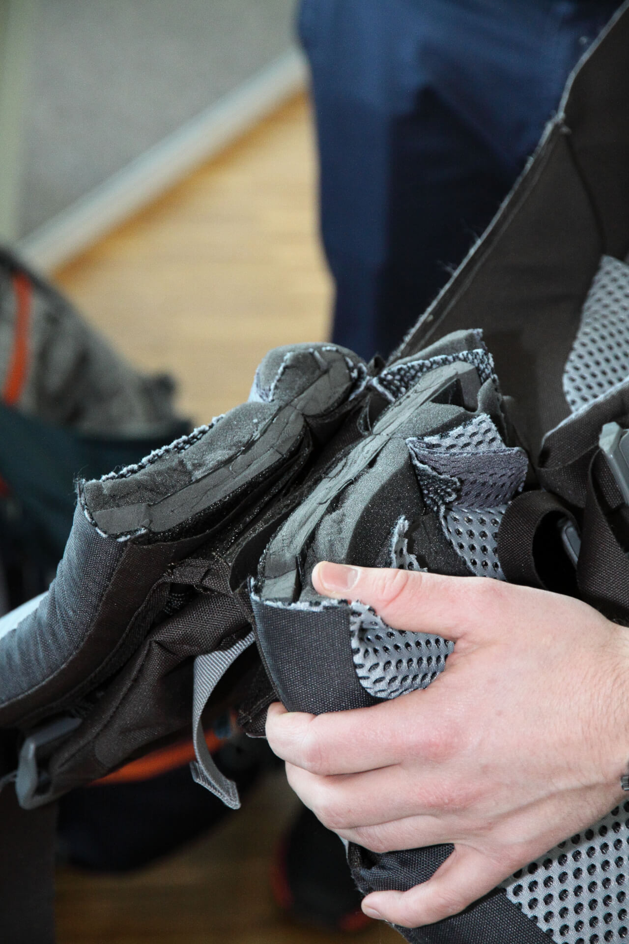 Zusammen mit dem BIKE 1 wurde auch das Airstripes System erfunden, bis heute eines der Kern-Features der Deuter Bike Rucksäcke. Zwei vertikale Polster links und rechts der Wirbelsäule sorgen dafür, dass sich der Rucksack schlüssig an den Rücken schmiegt, aber dennoch die Belüftung gewährleistet ist. Selbstverständlich wurde das Airstripes System ständig weiter entwickelt, wie uns Martin am Modell Transalpine zeigt, einem weiteren Klassiker der im Jahr 2000 auf den Markt kam. „Den sieht man heute noch in den Bergen, der ist nicht kaputt zu kriegen“, erzählt der Deuter-Spezialist weiter. Der Trans Alpine war so angesagt, dass ihn jeder haben wollte, vom Studenten bis zum Familienvater. „Viele dieser Exemplare haben nie eine Transalp gesehen“, fügt Martin lachend hinzu.