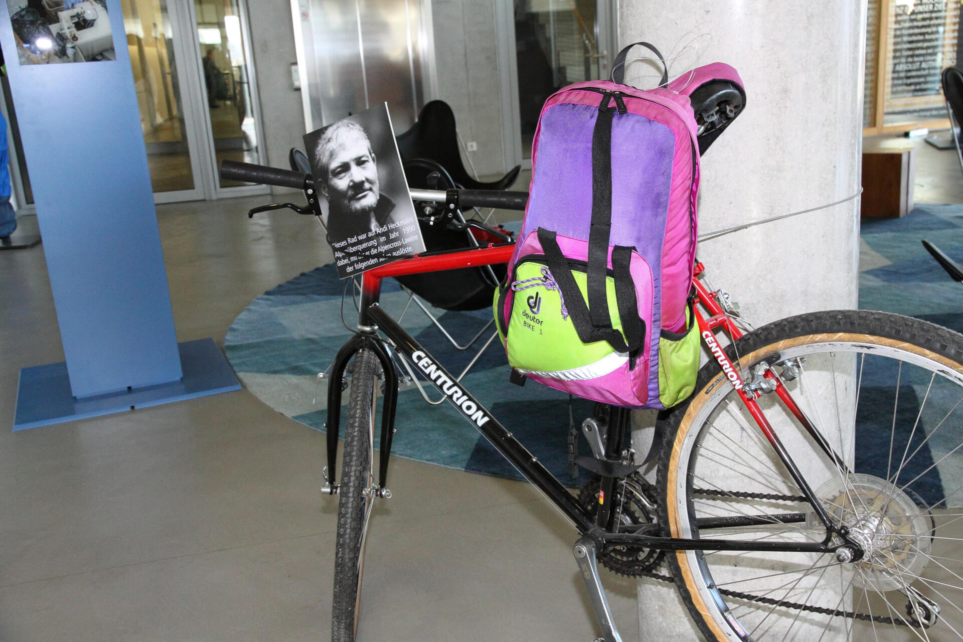 „Und darüber hinaus bis heute eine der schwersten Bikerouten über die Alpen“, sagt Martin Zanker als er uns lachend begrüßt. „Schmal sollte der neue Rucksack sein, lautete einer von Heckmairs Wünschen, damit man das Bike gut tragen kann.“ Das sagt bereits viel über den Charakter der Strecke aus: Die Heckmair-Route ist alles andere als eine Kaffefahrt. Erst recht nicht, wenn man sich Heckmairs Original Centurion Stahlbike von damals anschaut, das ebenfalls in der Halle ausgestellt ist. Ein echter Härtetest im Vergleich zum Komfort eines modernen Fullys.