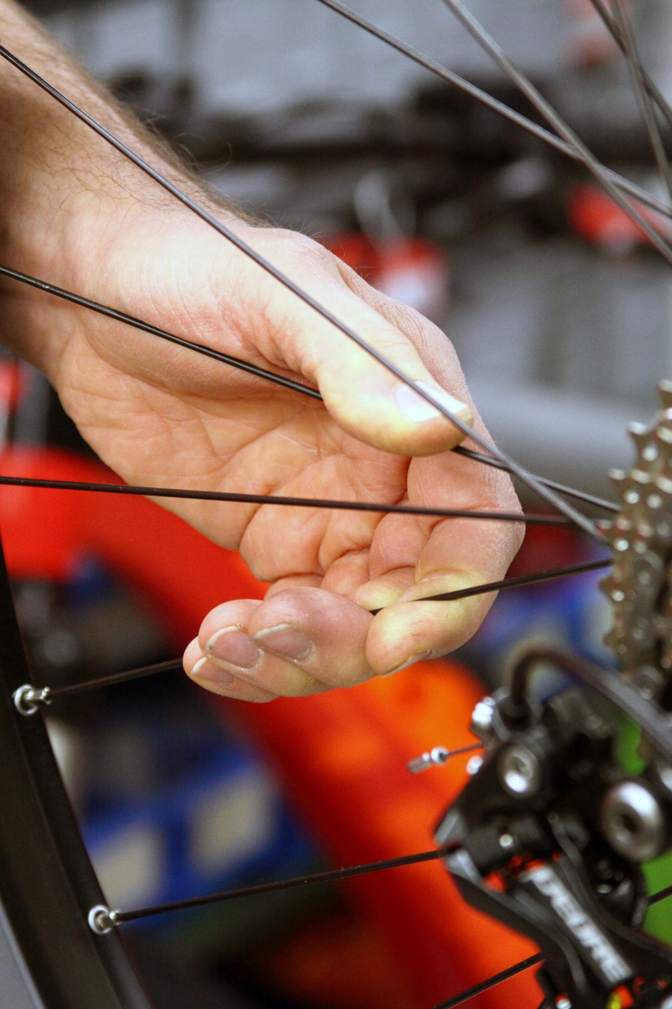 Schau dir das Bike ganz genau an. Auf diese Weise lassen sich zum Beispiel feine Risse aufspüren, die sich an älteren Rahmen oder Bauteilen gebildet haben können. Typische Problemzonen an Aluminium Rahmen sind die Schweißnähte im Bereich von Steuerrohr, Tretlager und Kettenstreben. Auch die Felgen zählen zu den stark beanspruchten Parts. Risse entstehen hier in der Regel im Bereich der Nippellöcher. Defekte oder beschädigte Parts, die man bereits bei der Sichtkontrolle entdeckt, müssen ausgetauscht werden.