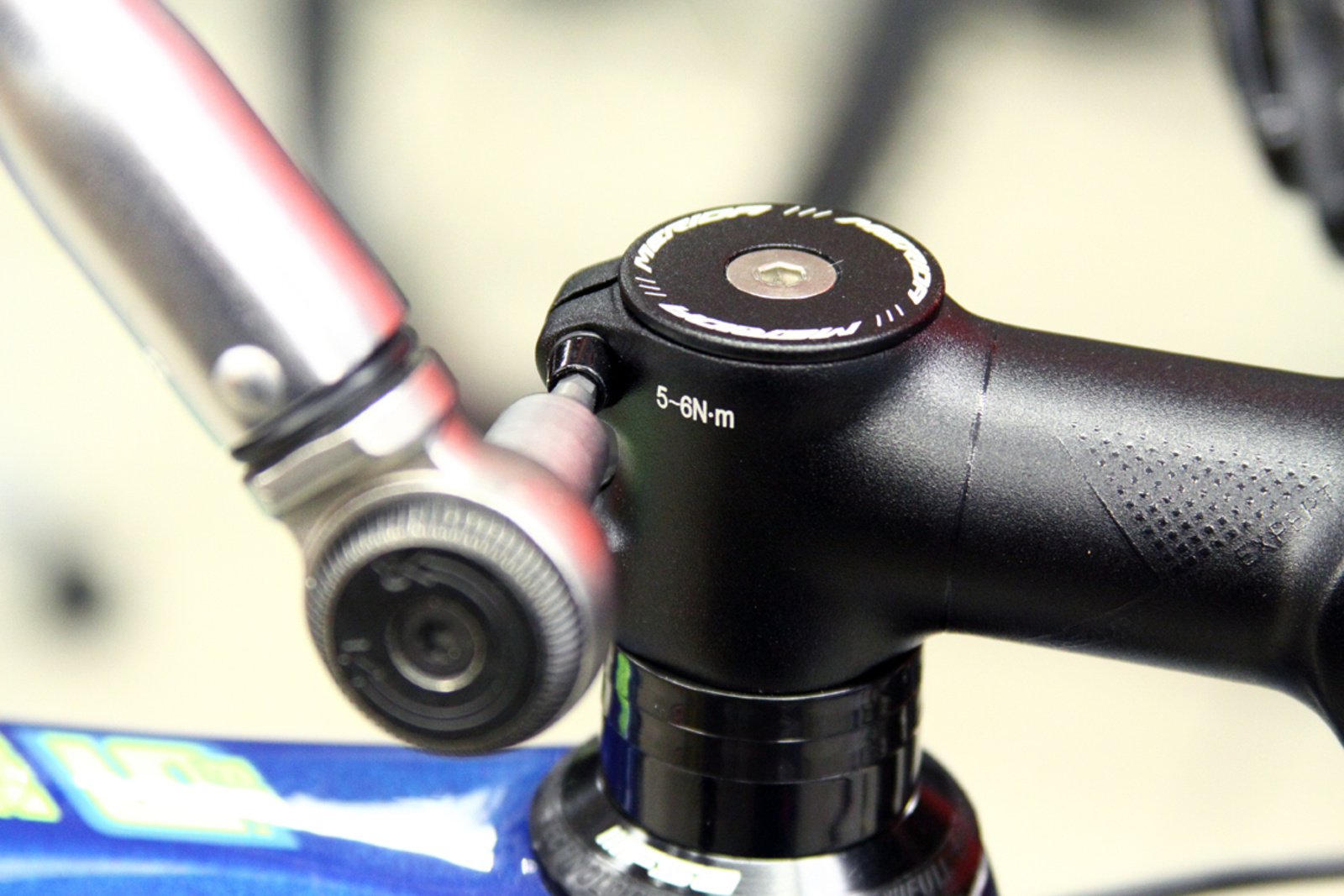 Ein loses Steuerlager bemerkt man oft nicht. Selbst ein nur minimal zu lose geklemmter Steuersatz kann durch die Vibrationen beim Fahren Schäden an den Lagern verursachen. Oder die Gabel kann sich zusammen mit dem Rahmen aufschwingen und für ein schwammiges Fahrgefühl sorgen. Ob das Lager Spiel hat lässt sich ganz leicht prüfen: Lege einen Finger um den Lagerspalt des oberen Lagers. Wenn du jetzt die Vorderbremse anziehst und gleichzeitig das Bike vor und zurück ruckelst, fühlst du selbst das geringste Spiel im Lager. Einstellen funktioniert so: Gabelschaft-Klemmschraube am Vorbau etwas lösen. Dann die Spannschraube oben auf dem Deckel mit Gefühl anziehen bis das Lagerspiel verschwunden ist. Abschließend den Vorbau wieder am Schaft klemmen.