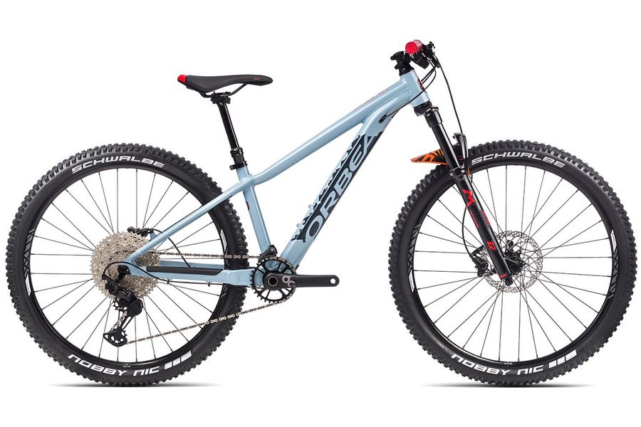 Der Rahmen des Laufey 27 H10 steht in Punkto Konstruktion dem eines hochwertigen Erwachsenenbikes nicht nach. Zum Einsatz kommt leichtes, dreifach konifiziertes Aluminium, alle Züge verlaufen im Inneren der Rohre. Die Mach 1 Klixx Systemlaufräder sitzen mit Hilfe stabiler Steckachsen in Rahmen und Gabel. Der 148 mm Boost-Standard sorgt für überragende Steifigkeit. Das Laufey kommt in der Version H10 mit einer pro-tauglichen Marzocchi Bomber Z2 Gabel, deren 120 mm Federweg sich mit Hilfe von Luftkammern optimal ans Körpergewicht von Kindern abstimmen lassen. Die Shimano XT 12-fach Schaltung und die Shimano Scheibenbremsen rangieren in dieser Klasse auf höchstem Niveau. Breite Schwalbe Nobby Nic Bereifung sorgt für Grip im Gelände. Eine weitere Besonderheit sind die hochwertigen, abgestimmten OC Komponenten (Orbea Custom) aus eigenem Haus. Dazu zählt auch die exklusive Teleskop-Sattelstütze, die das Laufey 27 H10 zu einem State-of-the-Art Trailbike für Kinder und Jugendliche macht.